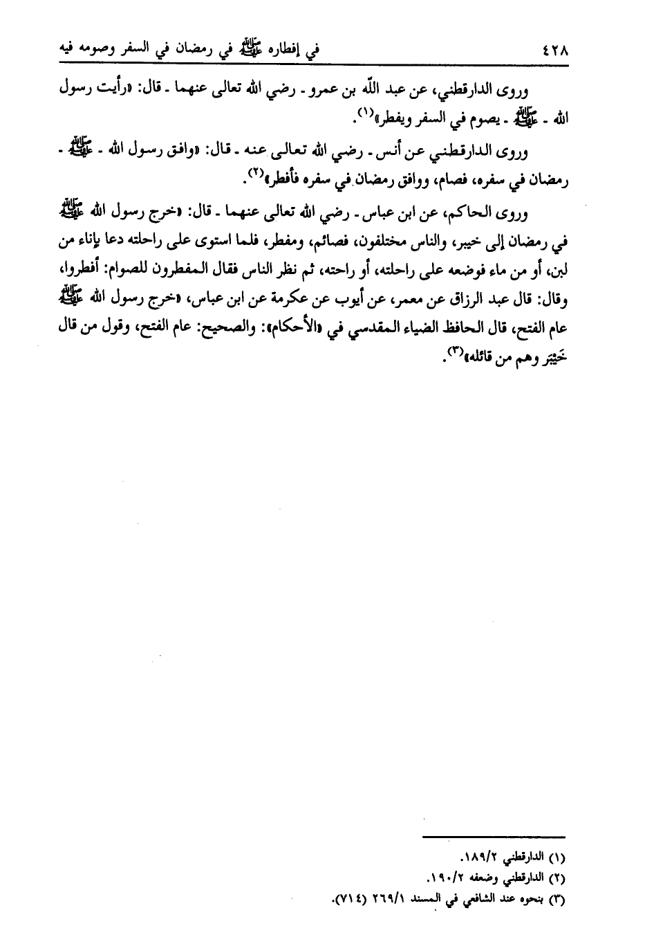 وروى الدارقطني، عن عبد الله بن عمرو- رضي الله تعالى عنهما- قال: «رأيت رسول الله- صلى الله عليه وسلّم- يصوم في السفر ويفطر» [ (1) ] .