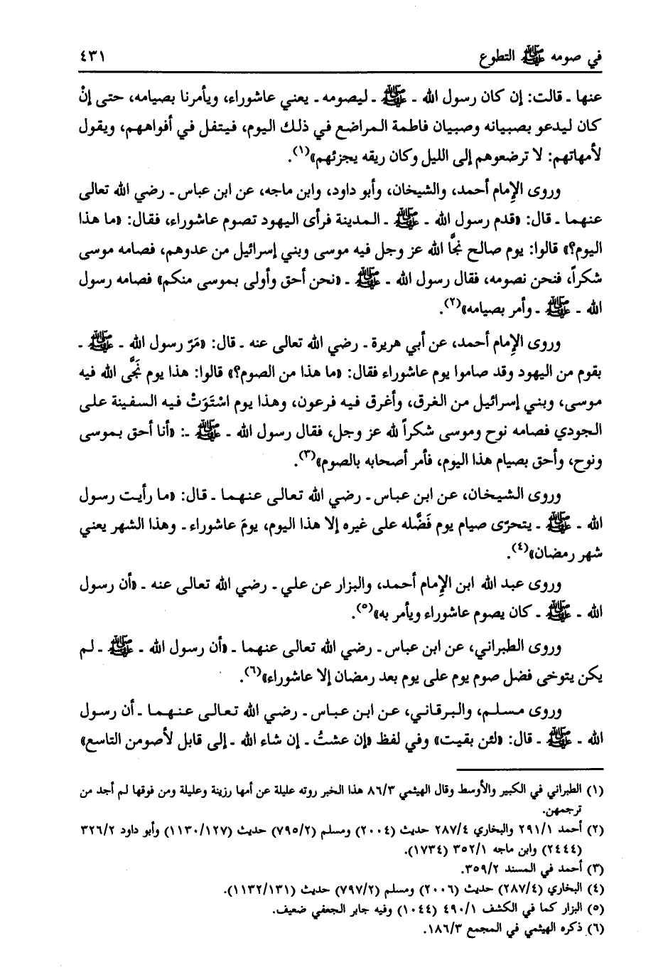 وروى الإمام أحمد، والشيخان، وأبو داود، وابن ماجة، عن ابن عباس- رضي الله تعالى عنهما- قال: «قدم رسول الله- صلى الله عليه وسلم- المدينة فرأى اليهود تصوم عاشوراء، فقال: «ما هذا اليوم؟» قالوا: يوم صالح نجّا الله عز وجل فيه موسى وبني إسرائيل من عدوهم، فصامه موسى شكرا، فنحن نصومه، فقال رسول الله- صلى الله عليه وسلّم- «نحن أحق وأولى بموسى منكم» فصامه رسول الله- صلى الله عليه وسلم- وأمر بصيامه» [ (2) ] .