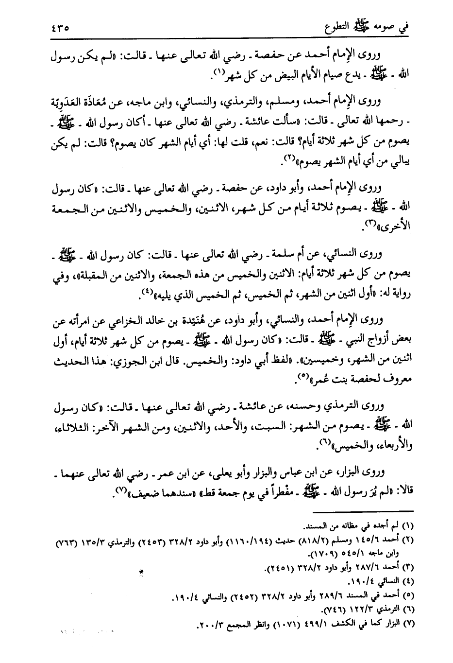 وروى الإمام أحمد، وأبو داود، عن حفصة- رضي الله تعالى عنها- قالت: «كان رسول الله- صلى الله عليه وسلّم- يصوم ثلاثة أيام من كل شهر، الاثنين، والخميس والاثنين من الجمعة الأخرى» [ (3) ] .