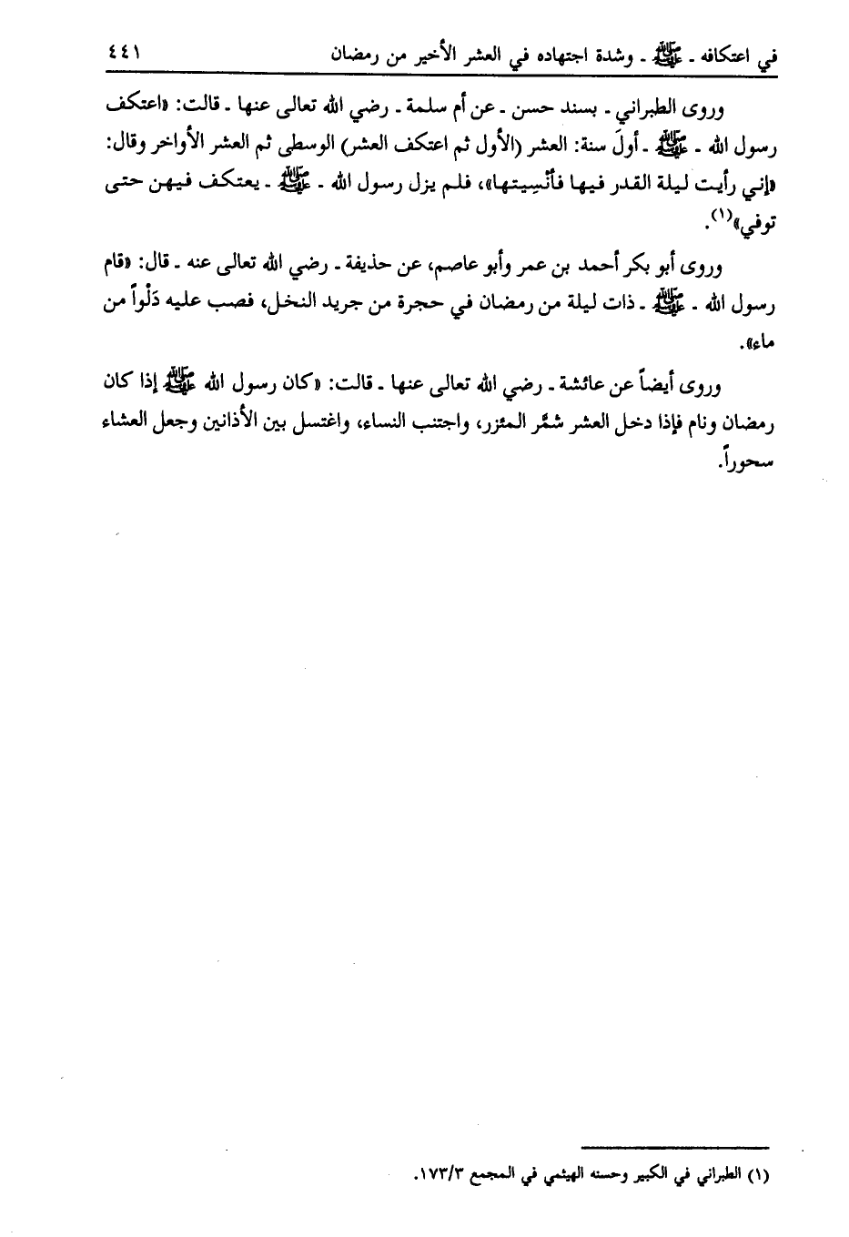 وروى الطبراني- بسند حسن- عن أم سلمة- رضي الله تعالى عنها- قالت: «اعتكف رسول الله- صلى الله عليه وسلم- أول سنة: العشر (الأول ثم اعتكف العشر) الوسطى ثم العشر الأواخر وقال:
