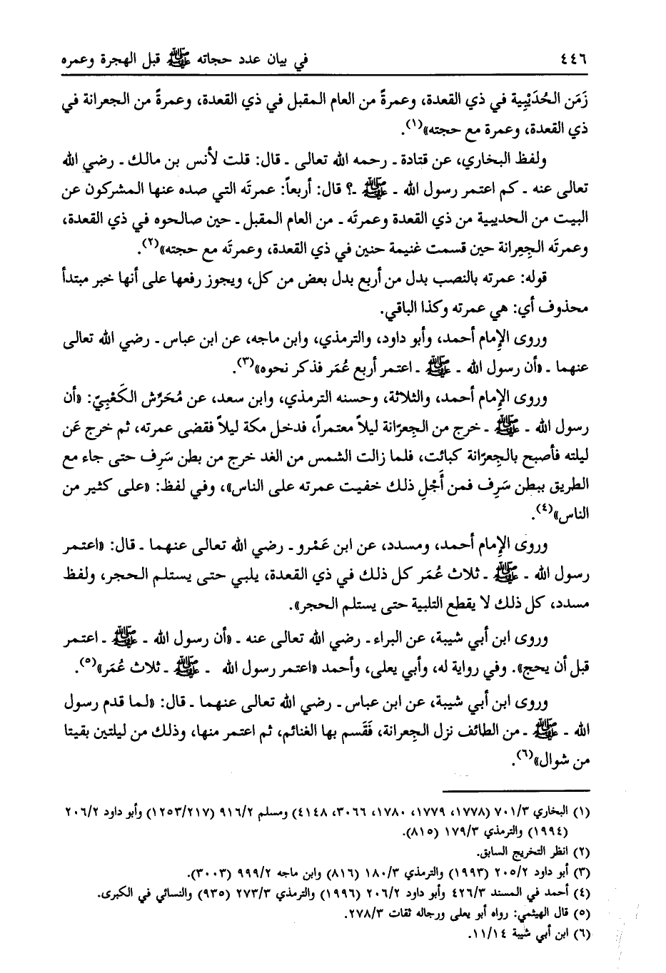 وروى الإمام أحمد، وأبو داود، والترمذي، وابن ماجة، عن ابن عباس- رضي الله تعالى عنهما- «أن رسول الله- صلى الله عليه وسلّم- اعتمر أربع عمر فذكر نحوه» [ (3) ] .