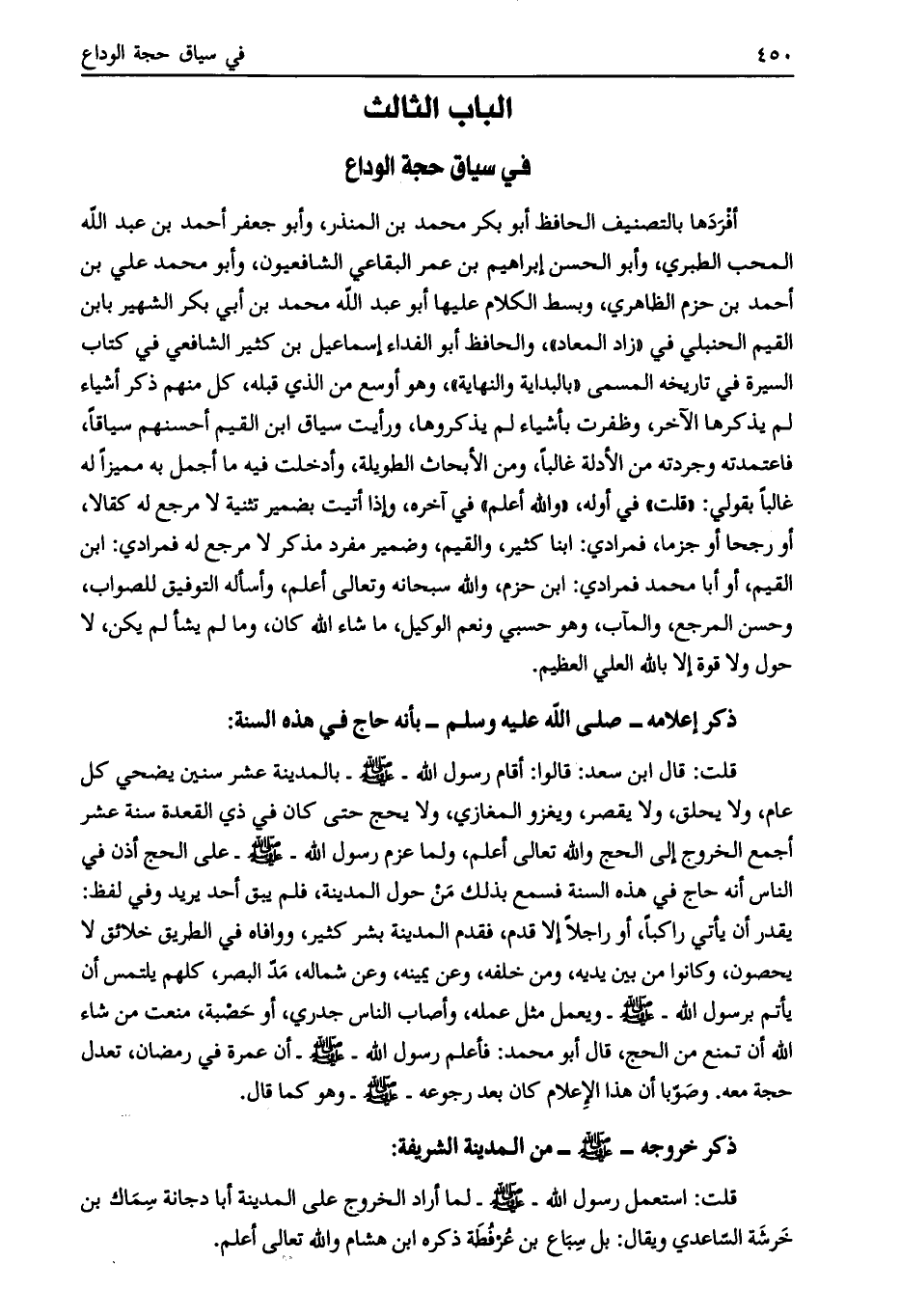 أفردها بالتصنيف الحافظ أبو بكر محمد بن المنذر، وأبو جعفر أحمد بن عبد الله المحب الطبري، وأبو الحسن إبراهيم بن عمر البقاعي الشافعيون، وأبو محمد علي بن أحمد بن حزم الظاهري، وبسط الكلام عليها أبو عبد الله محمد بن أبي بكر الشهير بابن القيم الحنبلي في «زاد المعاد» ، والحافظ أبو الفداء إسماعيل بن كثير الشافعي في كتاب السيرة في تاريخه المسمى «بالبداية والنهاية» ، وهو أوسع من الذي قبله، كل منهم ذكر أشياء لم يذكرها الآخر، وظفرت بأشياء لم يذكروها، ورأيت سياق ابن القيم أحسنهم سياقا، فاعتمدته وجردته من الأدلة غالبا، ومن الأبحاث الطويلة، وأدخلت فيه ما أجمل به مميزا له غالبا بقولي: «قلت» في أوله، «والله أعلم» في آخره، وإذا أتيت بضمير تثنية لا مرجع له كقالا، أو رجحا أو جزما، فمرادي: ابنا كثير، والقيم، وضمير مفرد مذكر لا مرجع له فمرادي: ابن القيم، أو أبا محمد فمرادي: ابن حزم، والله سبحانه وتعالى أعلم، وأسأله التوفيق للصواب، وحسن المرجع، والمآب، وهو حسبي ونعم الوكيل، ما شاء الله كان، وما لم يشأ لم يكن، لا حول ولا قوة إلا بالله العلي العظيم.
