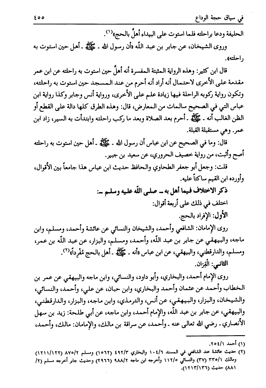 روى الإمامان: الشافعي وأحمد، والشيخان والنسائي عن عائشة وأحمد، ومسلم، وابن ماجه، والبيهقي عن جابر بن عبد الله، وأحمد، ومسلم، والبزار، عن عبد الله بن عمر، ومسلم، والدارقطني، والبيهقي، عن ابن عباس «أنه- صلى الله عليه وسلم- أهل بالحج مفردا» [ (2) ] .