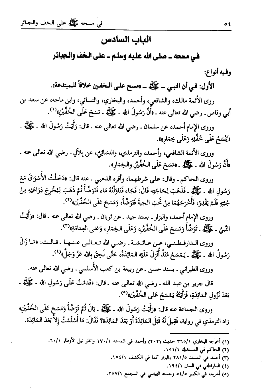 روى الأئمة مالك، والشافعي، وأحمد، والبخاري، والنسائي، وابن ماجه، عن سعد بن أبي وقاص- رضي الله تعالى عنه- «أن رسول الله- صلى الله عليه وسلم- مسح على الخفّين» [ (1) ] .