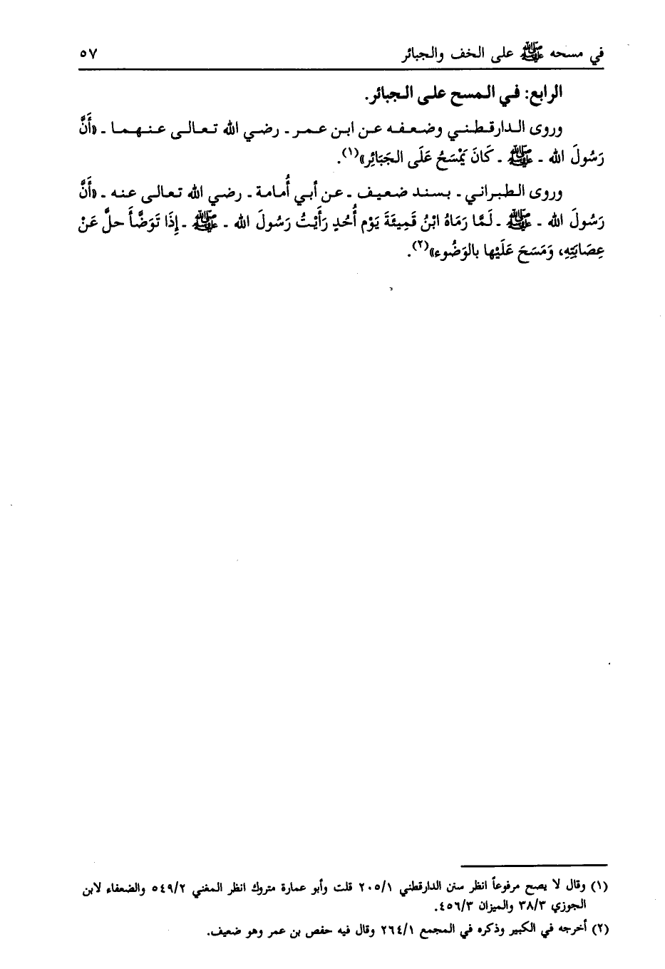 وروى الدارقطني وضعفه عن ابن عمر- رضي الله تعالى عنهما- «أن رسول الله- صلى الله عليه وسلم- كان يمسح على الجبائر» [ (1) ] .