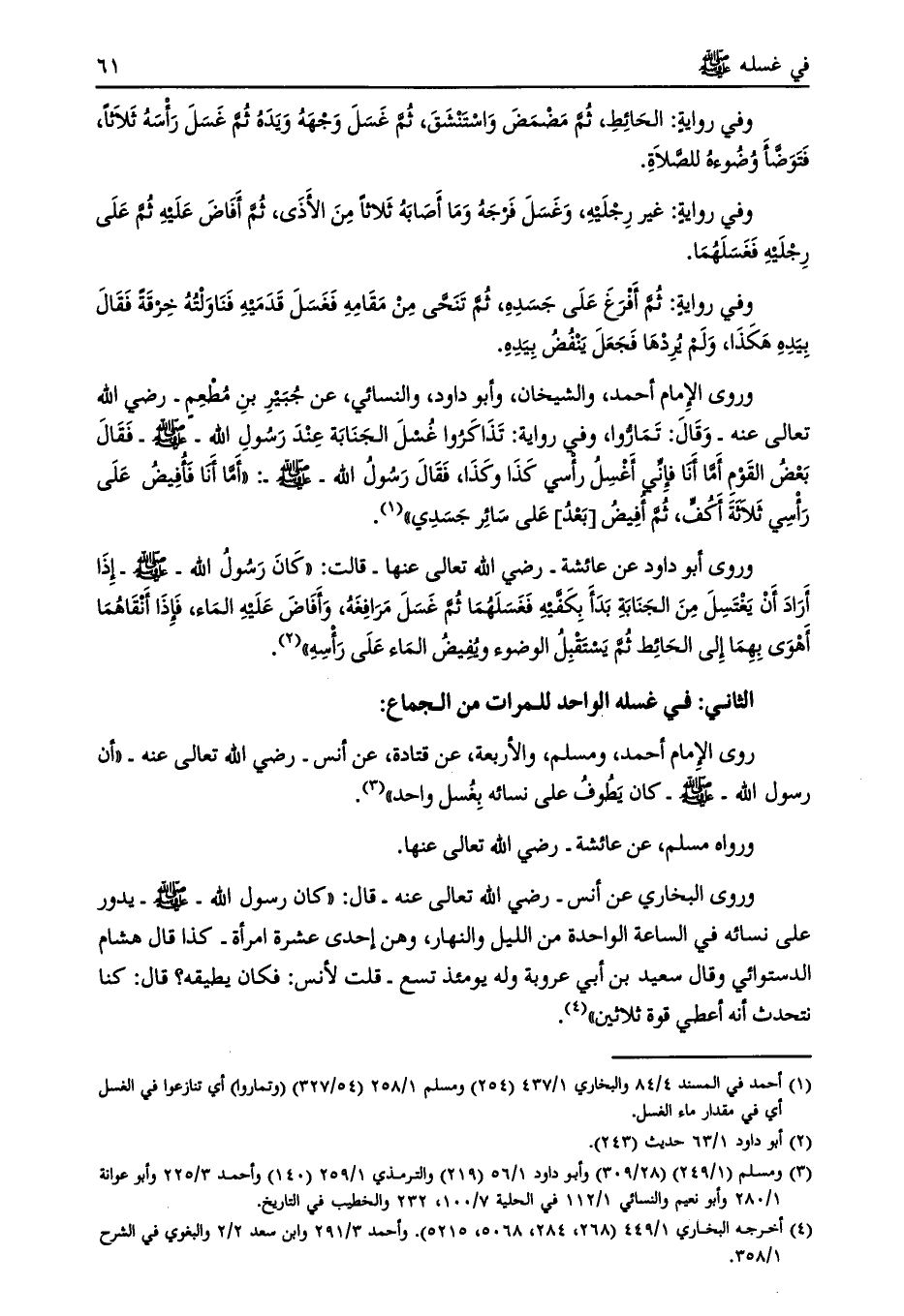 روى الإمام أحمد، ومسلم، والأربعة، عن قتادة، عن أنس- رضي الله تعالى عنه- «أن رسول الله- صلى الله عليه وسلم- كان يطوف على نسائه بغسل واحد» [ (3) ] .