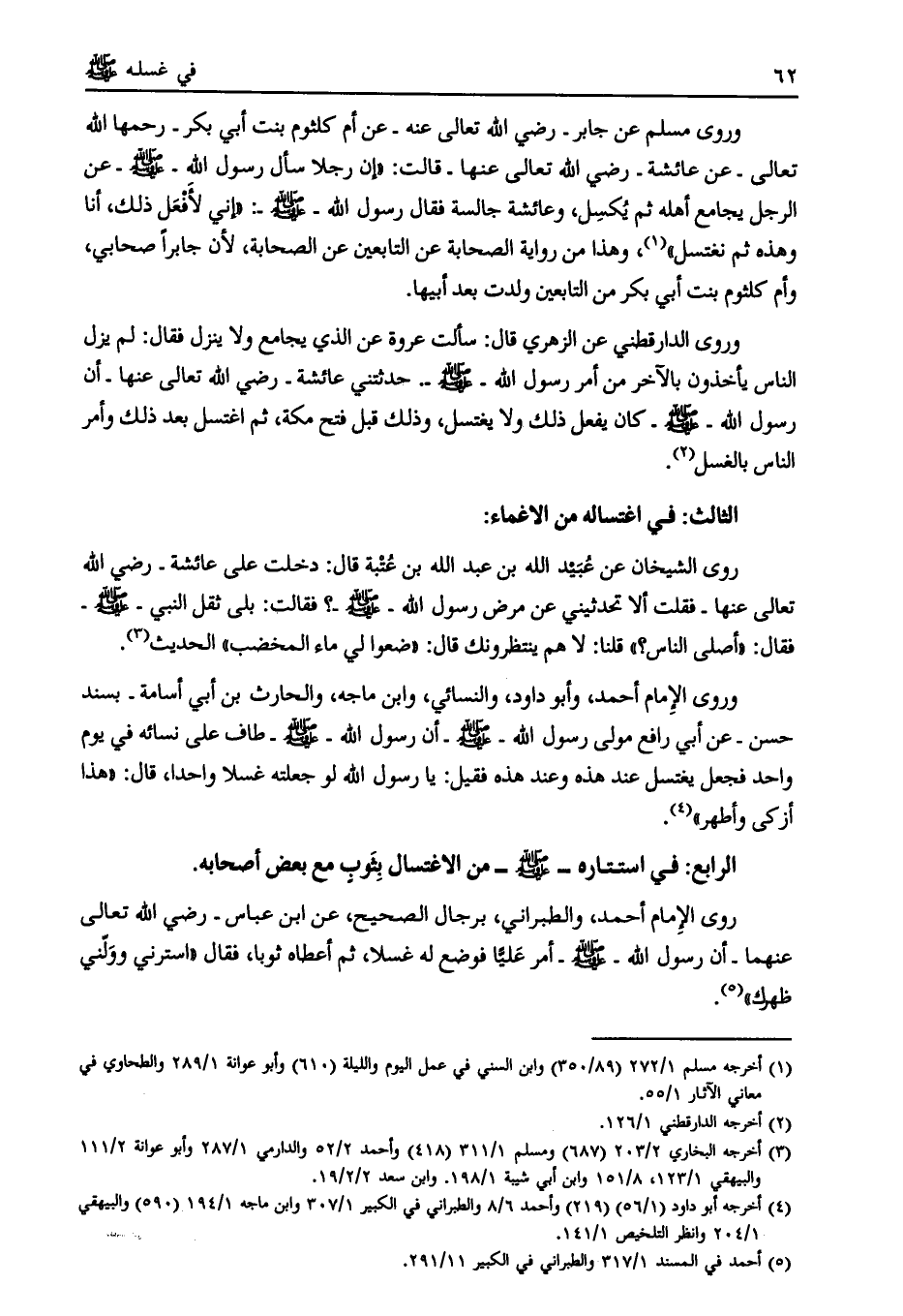 وروى الإمام أحمد، وأبو داود، والنسائي، وابن ماجة، والحارث بن أبي أسامة- بسند حسن- عن أبي رافع مولى رسول الله- صلى الله عليه وسلم- أن رسول الله- صلى الله عليه وسلم- طاف على نسائه في يوم واحد فجعل يغتسل عند هذه وعند هذه فقيل: يا رسول الله لو جعلته غسلا واحدا، قال: «هذا أزكى وأطهر» [ (4) ] .