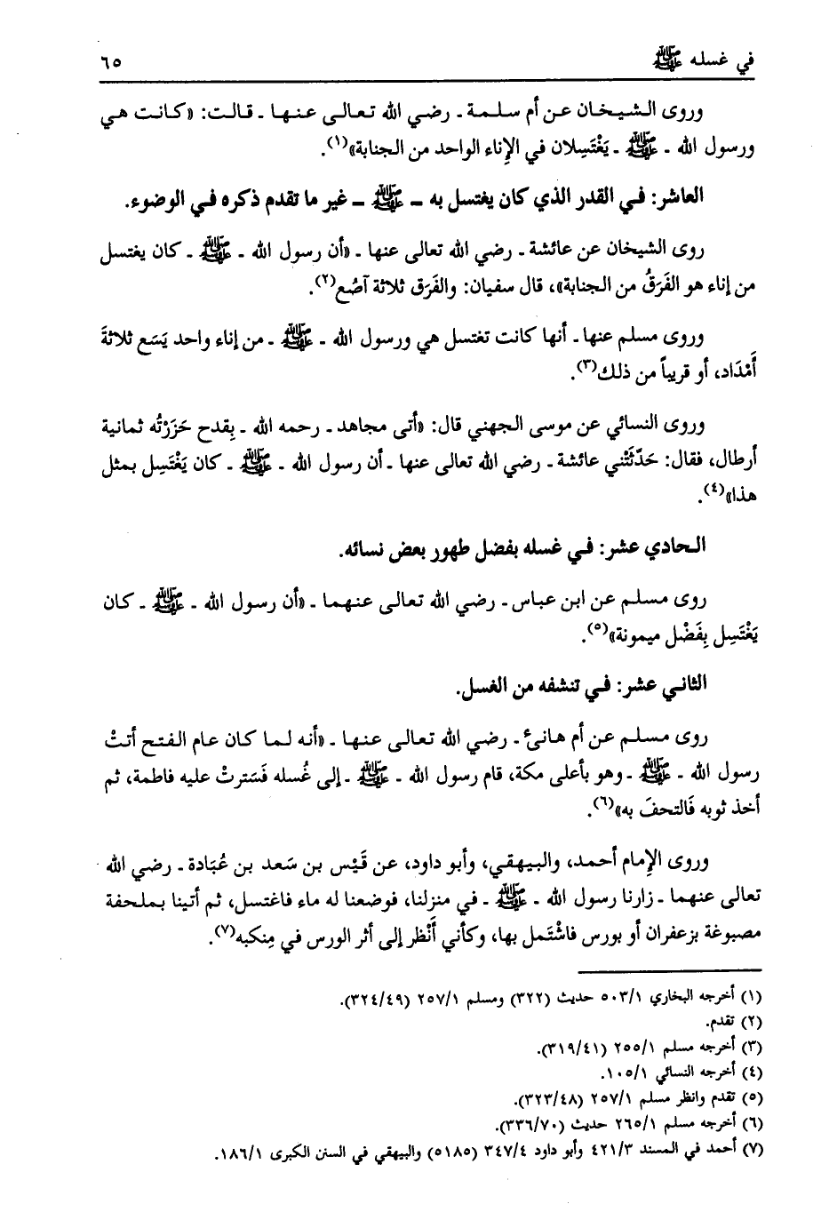وروى النسائي عن موسى الجهني قال: «أتى مجاهد- رحمه الله- بقدح حزرته ثمانية أرطال، فقال: حدّثتني عائشة- رضي الله تعالى عنها- أن رسول الله- صلى الله عليه وسلم- كان يغتسل بمثل هذا» [ (4) ] .