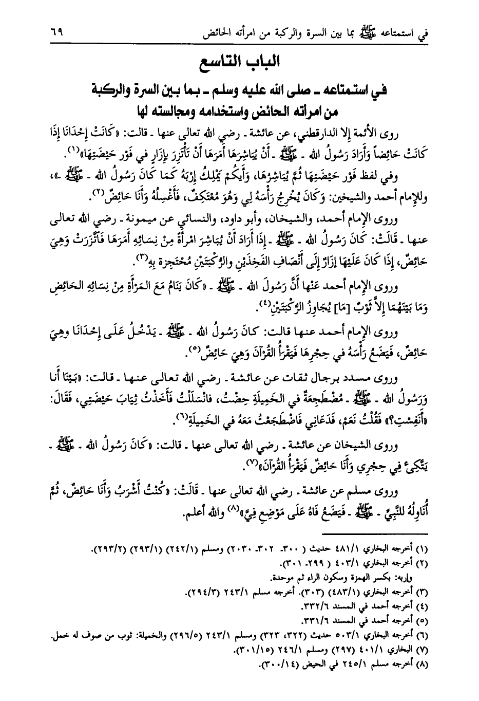 الباب التاسع في استمتاعه- صلى الله عليه وسلّم- بما بين السّرة والركبة من امرأته الحائض واستخدامه ومجالسته لها