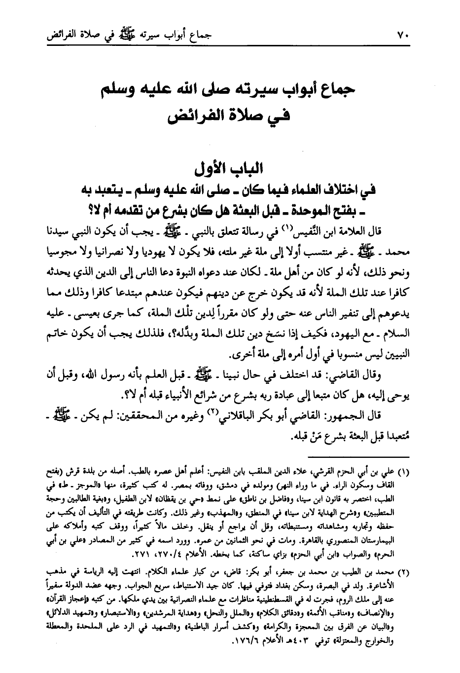 قال العلامة ابن النّفيس [ (1) ] في رسالة تتعلق بالنبي- صلى الله عليه وسلّم- يجب أن يكون النبي سيدنا محمد- صلى الله عليه وسلم- غير منتسب أولا إلى ملة غير ملته، فلا يكون لا يهوديّاً ولا نصرانياً ولا مجوسيا ونحو ذلك، لأنه لو كان من أهل ملة- لكان عند دعواه النبوة دعا الناس إلى الدين الذي يحدثه كافرا عند تلك الملة لأنه قد يكون خرج عن دينهم فيكون عندهم مبتدعا كافرا وذلك مما يدعوهم إلى تنفير الناس عنه حتى ولو كان مقررا لدين تلك الملة، كما جرى بعيسى- عليه السلام- مع اليهود، فكيف إذا نسخ دين تلك الملة وبدّله؟، فلذلك يجب أن يكون خاتم النبيين ليس منسوبا في أول أمره إلى ملة أخرى.