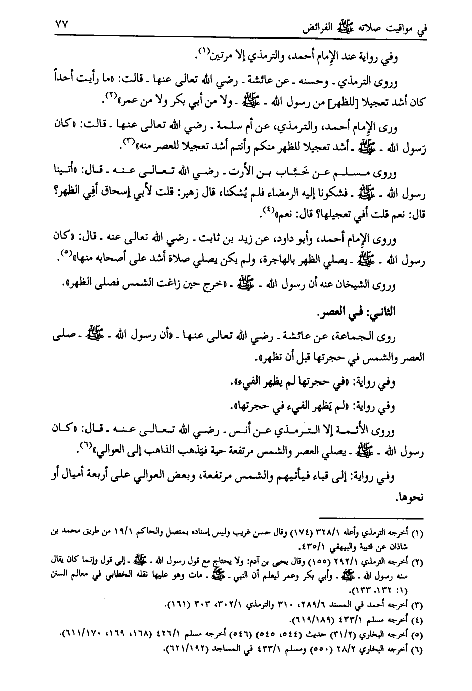 وروى الأئمة إلا الترمذي عن أنس- رضي الله تعالى عنه- قال: «كان رسول الله- صلى الله عليه وسلم- يصلي العصر والشمس مرتفعة حية فيذهب الذاهب إلى العوالي» [ (6) ] .