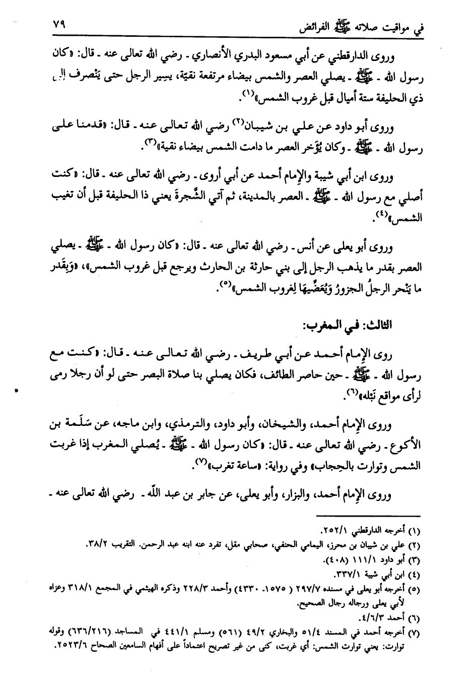 وروى الدارقطني عن أبي مسعود البدري الأنصاري- رضي الله تعالى عنه- قال: «كان رسول الله- صلى الله عليه وسلّم- يصلي العصر والشمس بيضاء مرتفعة نقيّة، يسير الرجل حتى ينصرف إلى ذي الحليفة ستة أميال قبل غروب الشمس» [ (1) ] .