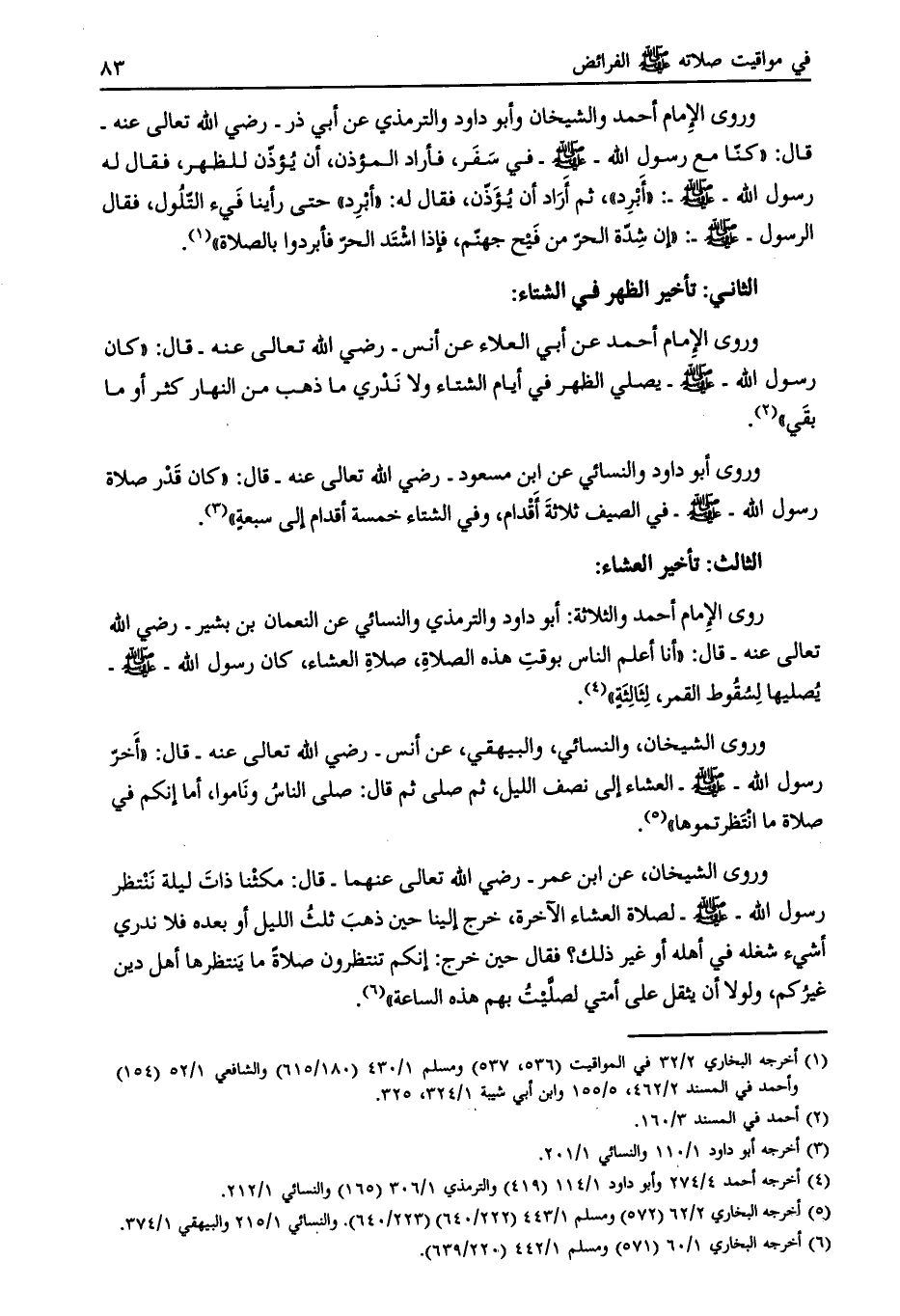 وروى أبو داود والنسائي عن ابن مسعود- رضي الله تعالى عنه- قال: «كان قدر صلاة رسول الله- صلى الله عليه وسلم- في الصيف ثلاثة أقدام، وفي الشتاء خمسة أقدام إلى سبعة» [ (3) ] .