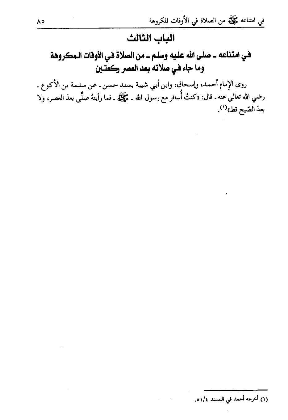 روى الإمام أحمد، وإسحاق، وابن أبي شيبة بسند حسن- عن سلمة بن الأكوع- رضي الله تعالى عنه- قال: «كنت أسافر مع رسول الله- صلى الله عليه وسلّم- فما رأيته صلّى بعد العصر، ولا بعد الصّبح قط» [ (1) ] .