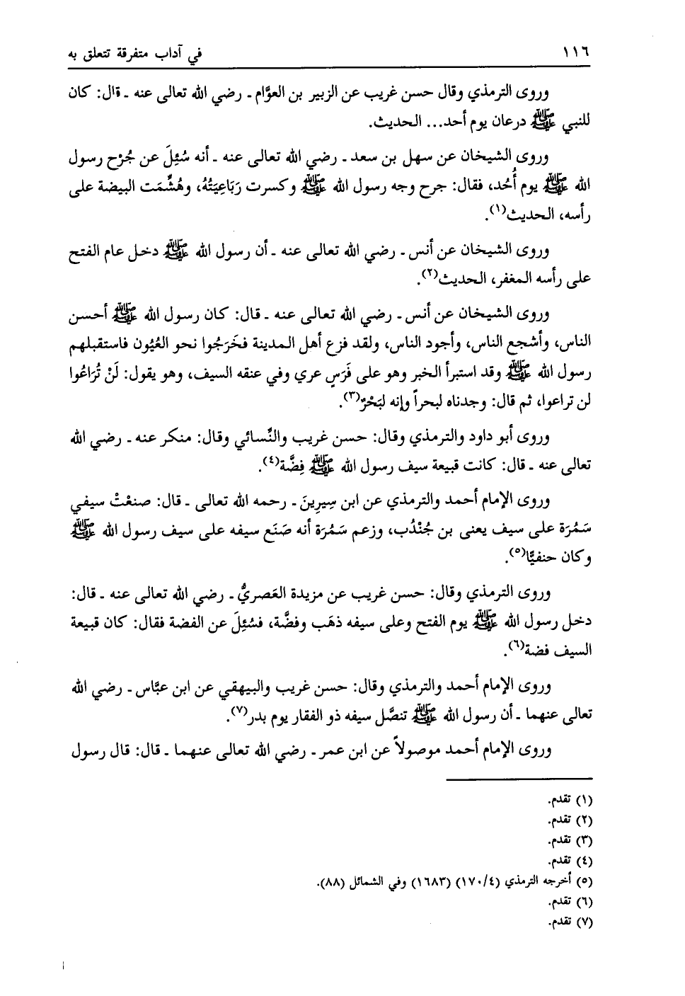 وروى أبو داود والترمذي وقال: حسن غريب والنّسائي وقال: منكر عنه- رضي الله تعالى عنه- قال: كانت قبيعة سيف رسول الله صلى الله عليه وسلم فضّة [ (4) ] .