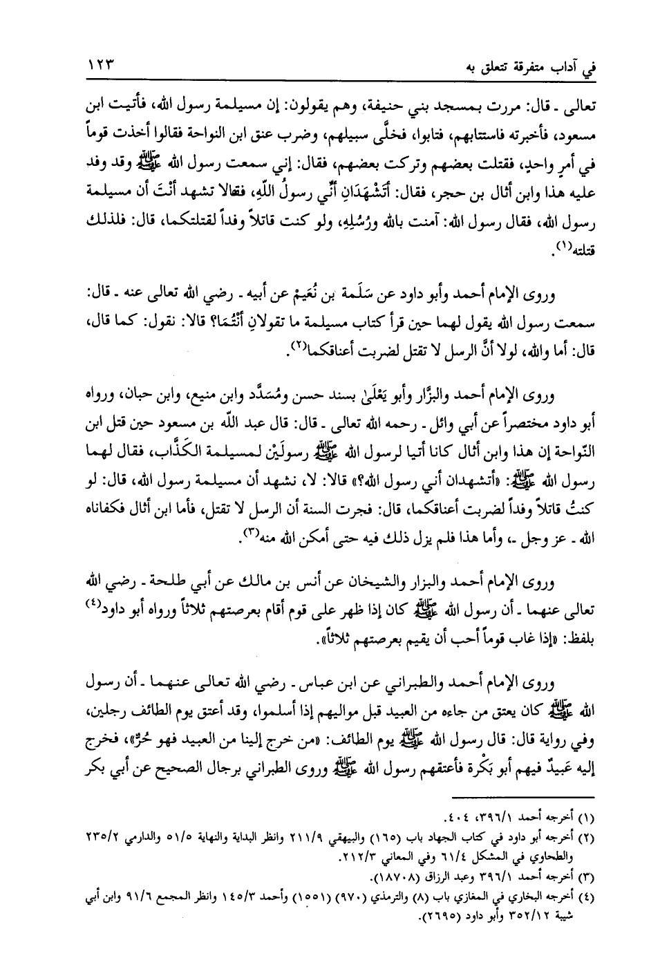 وروى الإمام أحمد والبزار وأبو يعلى بسند حسن ومسدّد وابن منيع، وابن حبان، ورواه أبو داود مختصرا عن أبي وائل- رحمه الله تعالى- قال: قال عبد الله بن مسعود حين قتل ابن النّواحة إن هذا وابن أثال كانا أتيا لرسول الله صلى الله عليه وسلم رسولين لمسيلمة الكذّاب، فقال لهما رسول الله صلى الله عليه وسلم: «أتشهدان أني رسول الله؟» قالا: لا، نشهد أن مسيلمة رسول الله، قال: لو كنت قاتلا وفدا لضربت أعناقكما، قال: فجرت السنة أن الرسل لا تقتل، فأما ابن أثال فكفاناه الله- عز وجل-، وأما هذا فلم يزل ذلك فيه حتى أمكن الله منه [ (3) ] .