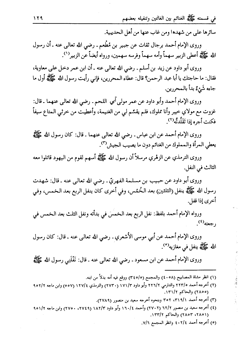 وروى الإمام أحمد برجال ثقات عن جبير بن مطعم- رضي الله تعالى عنه- أن رسول الله صلى الله عليه وسلم أعطي الزبير سهما وأمه سهما وفرسه سهمين، ورواه أيضاً عن الزبير [ (1) ] .