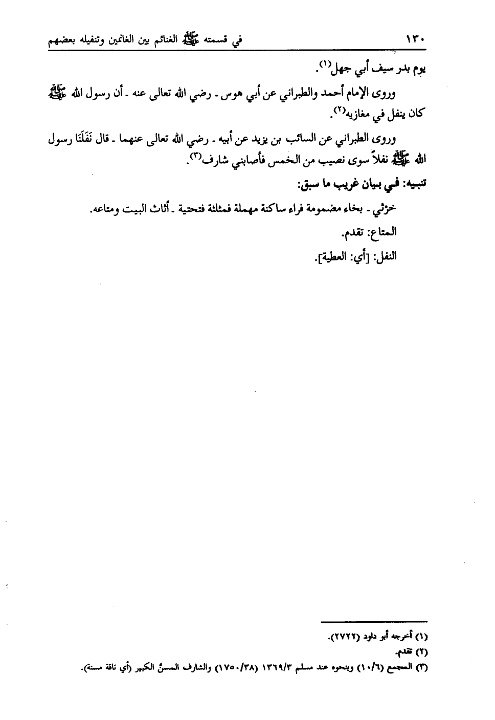 وروى الطبراني عن السائب بن يزيد عن أبيه- رضي الله تعالى عنهما- قال نفلنا رسول الله صلى الله عليه وسلم نفلا سوى نصيب من الخمس فأصابني شارف [ (3) ] .