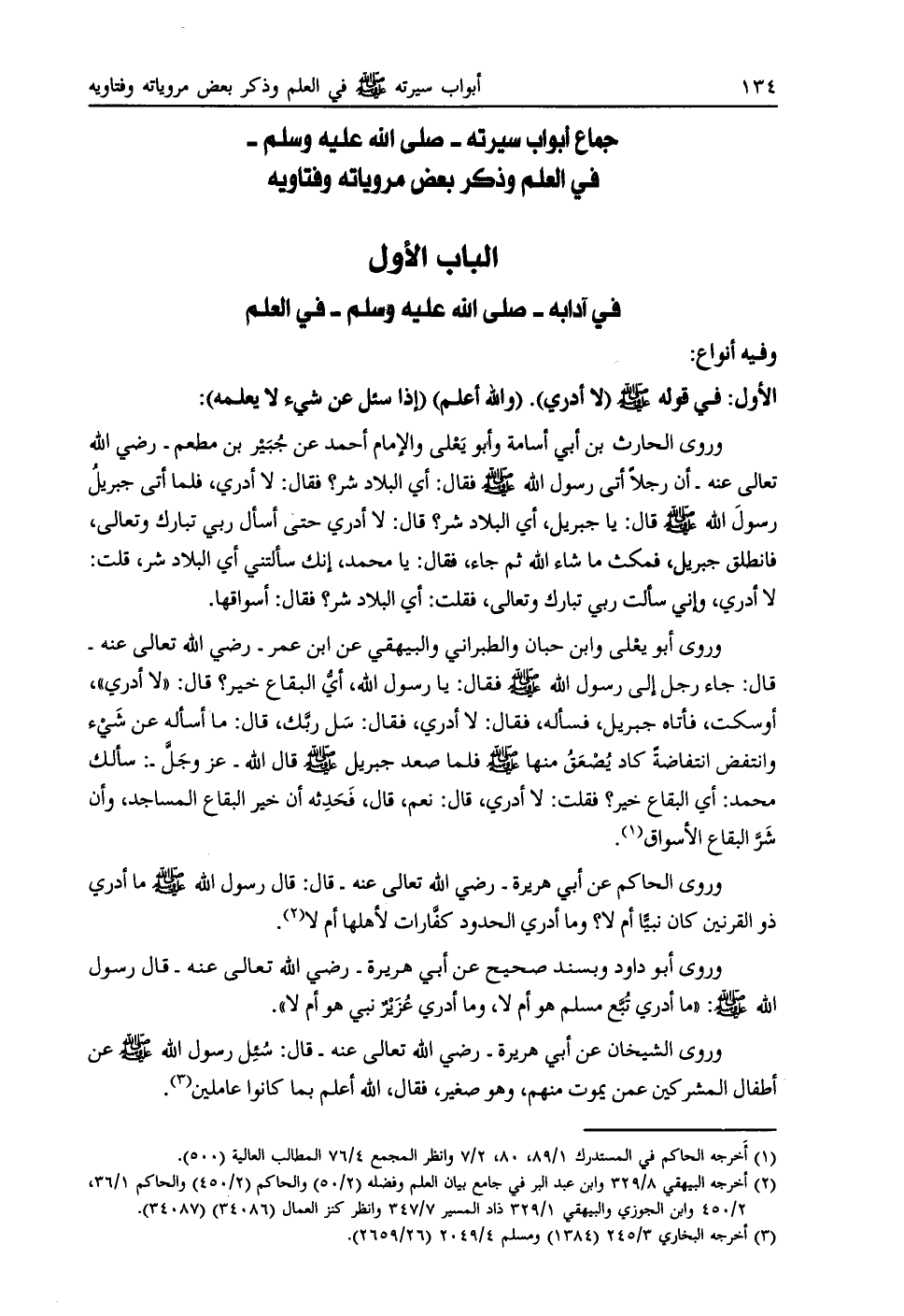 جماع أبواب سيرته- صلى الله عليه وسلم- في العلم وذكر بعض مروياته وفتاويه