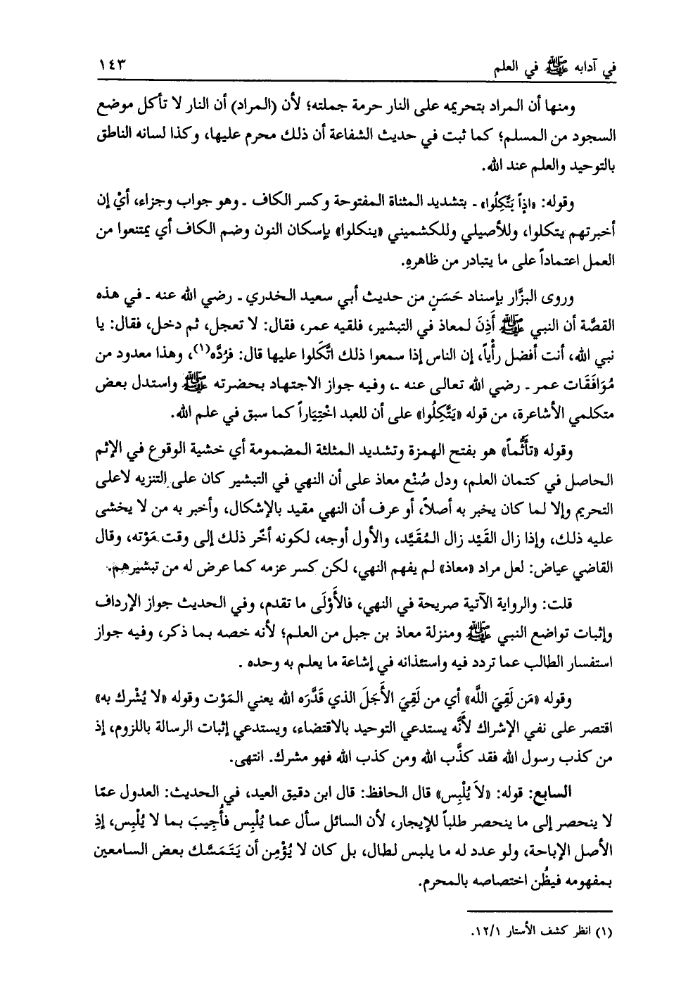 وقوله «تأثّما» هو بفتح الهمزة وتشديد المثلثة المضمومة أي خشية الوقوع في الإثم الحاصل في كتمان العلم، ودل صنع معاذ على أن النهي في التبشير كان على التنزيه لا على التحريم وإلا لما كان يخبر به أصلا، أو عرف أن النهي مقيد بالإشكال، وأخبر به من لا يخشى عليه ذلك، وإذا زال القيد زال المقيّد، والأول أوجه، لكونه أخّر ذلك إلى وقت موته، وقال القاضي عياض: لعل مراد «معاذ» لم يفهم النهي، لكن كسر عزمه كما عرض له من تبشيرهم.
