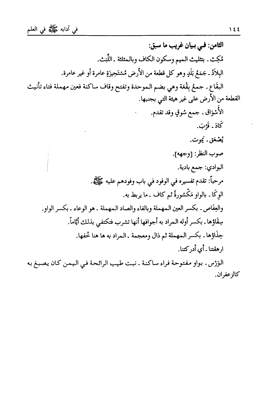 البقاع- جمع بقعة وهي بضم الموحدة وتفتح وقاف ساكنة فعين مهملة فتاء تأنيث القطعة من الأرض على غير هيئة التي بجنبها.