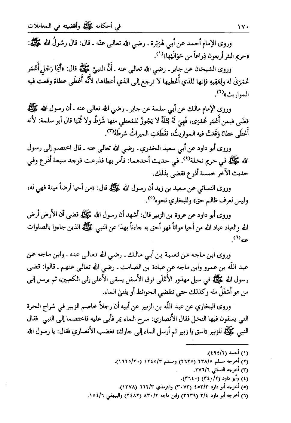 وروى البخاري عن عبد الله بن الزبير عن أبيه أن رجلا خاصم الزبير في شراج الحرة التي يسقون فيها النخل فقال الأنصاري: سرح الماء يمر فأبى عليه فاختصما إلى النبي فقال النبي صلى الله عليه وسلم للزبير «اسق يا زبير ثم أرسل الماء إلى جارك» فغضب الأنصاري فقال: يا رسول الله