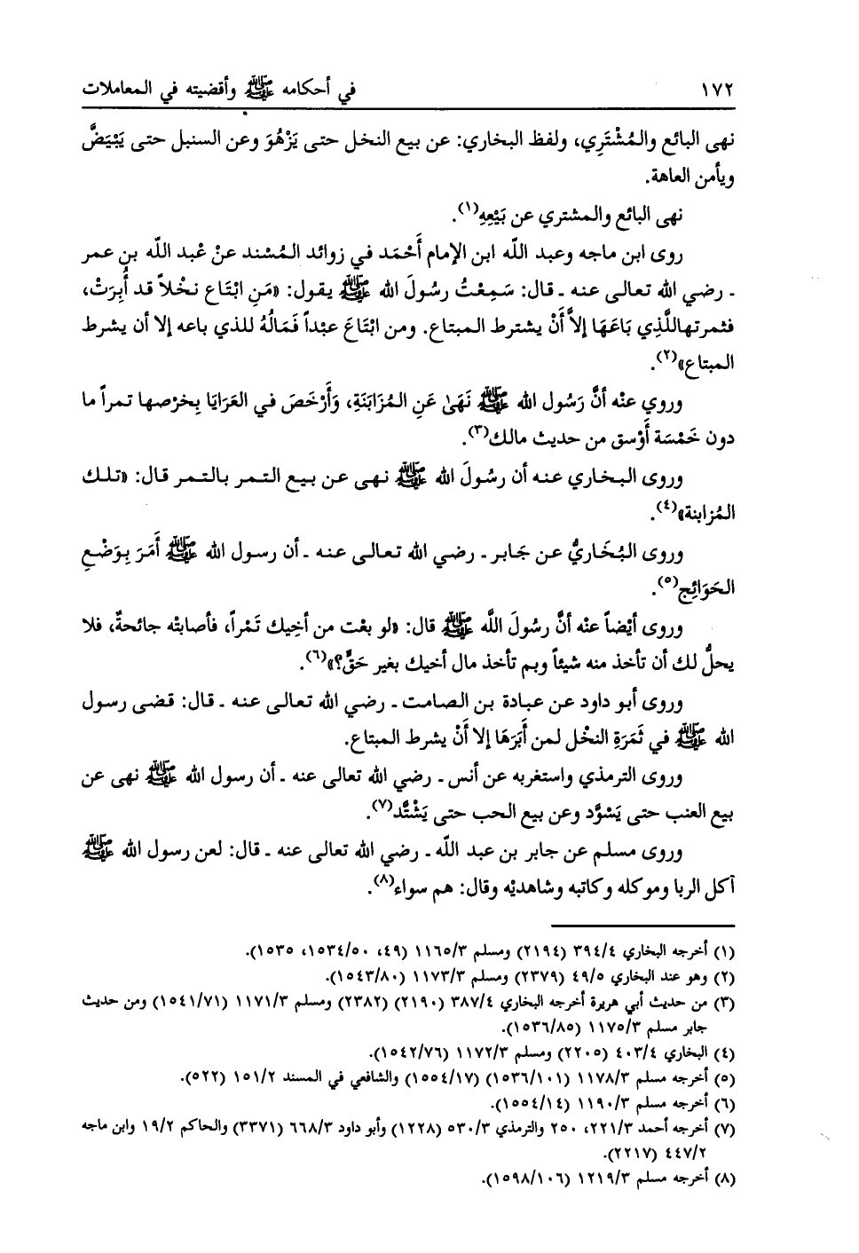 روى ابن ماجة وعبد الله ابن الإمام أحمد في زوائد المسند عن عبد الله بن عمر- رضي الله تعالى عنه- قال: سمعت رسول الله صلى الله عليه وسلم يقول: «من ابتاع نخلا قد أبرت، فثمرتها للّذي باعها إلّا أن يشترط المبتاع. ومن ابتاع عبدا فماله للذي باعه إلا أن يشرط المبتاع» [ (2) ] .