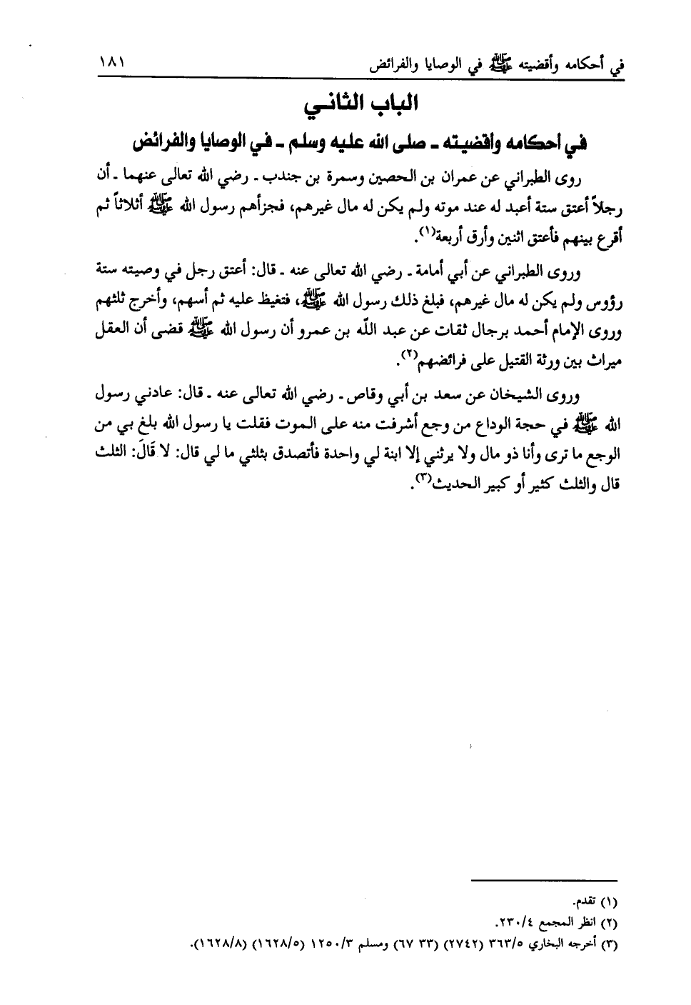 الباب الثاني في أحكامه وأقضيته- صلى الله عليه وسلم- في الوصايا والفرائض