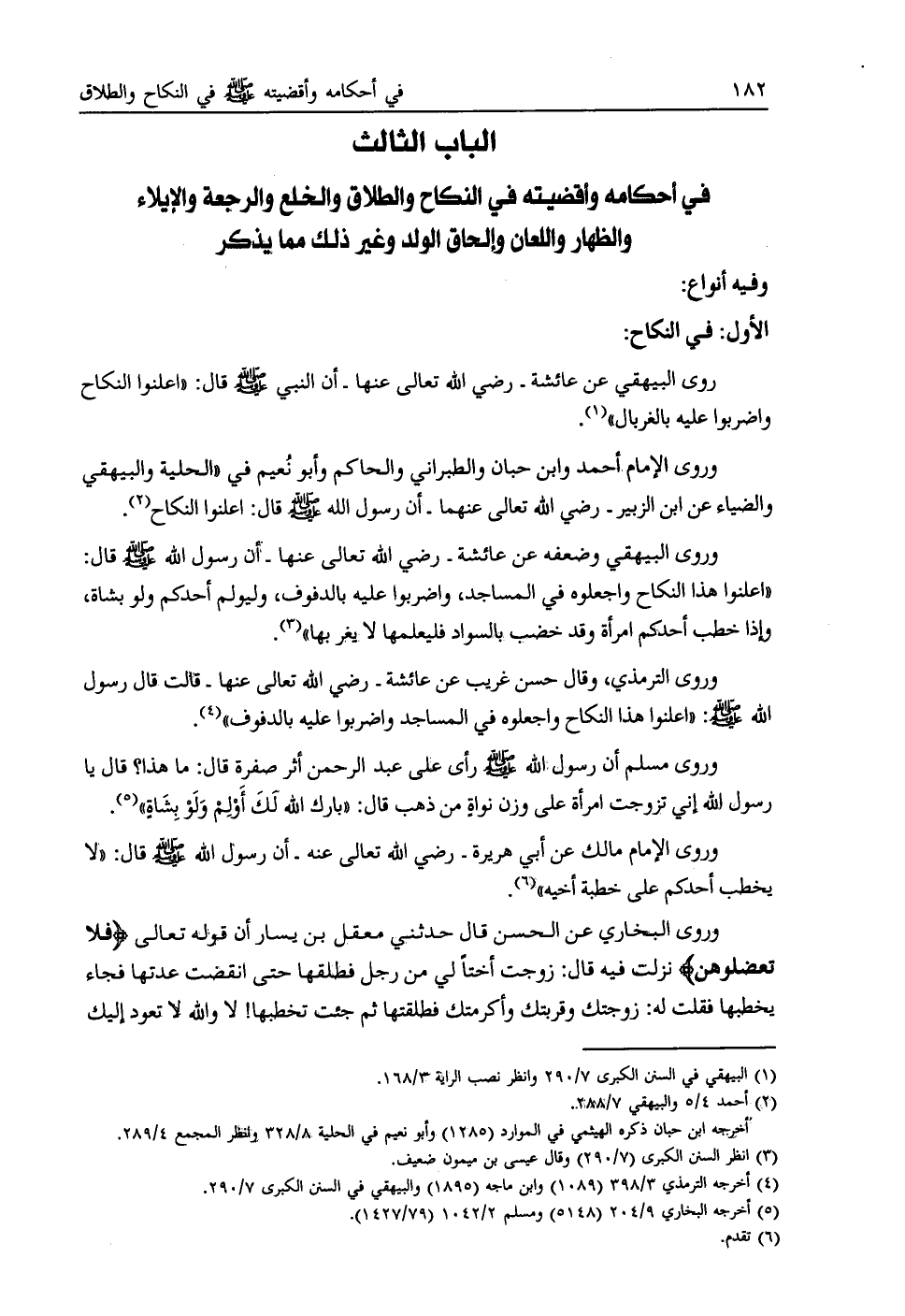 وروى الإمام أحمد وابن حبان والطبراني والحاكم وأبو نعيم في «الحلية والبيهقي والضياء عن ابن الزبير- رضي الله تعالى عنهما- أن رسول الله صلى الله عليه وسلم قال: أعلنوا النكاح [ (2) ] .