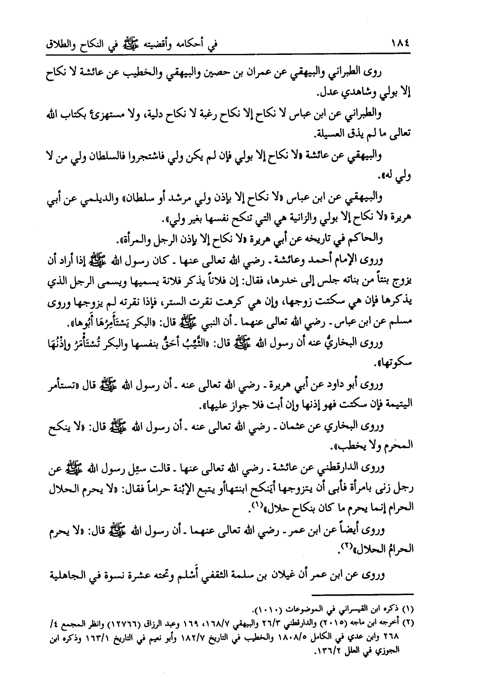 والبيهقي عن ابن عباس «لا نكاح إلا بإذن ولي مرشد أو سلطان» والديلمي عن أبي هريرة «لا نكاح إلا بولي والزانية هي التي تنكح نفسها بغير ولي» .