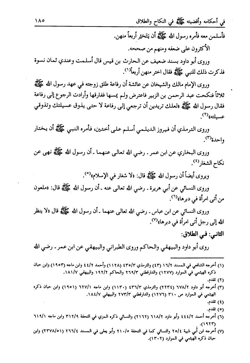 وروى أبو داود بسند ضعيف عن الحارث بن قيس قال أسلمت وعندي ثمان نسوة فذكرت ذلك للنبي صلى الله عليه وسلم فقال اختر منهن أربعا
