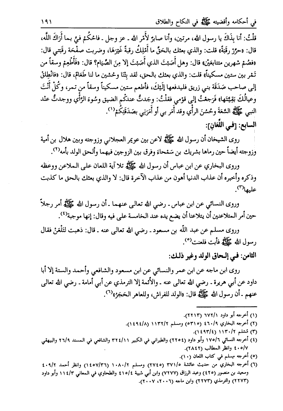 روى ابن ماجة عن ابن عمر والنسائي عن ابن مسعود والشافعي وأحمد والستة إلا أبا داود عن أبي هريرة- رضي الله تعالى عنه- والأئمة إلا الترمذي عن أبي أمامة- رضي الله تعالى عنهم- أن رسول الله صلى الله عليه وسلم قال: «الولد للفراش، وللعاهر الحجر» [ (6) ] .