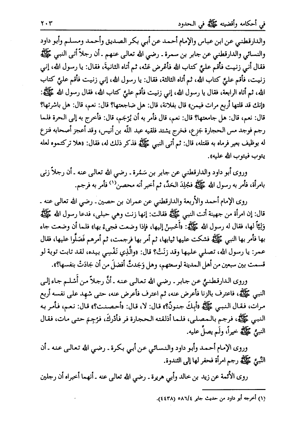 والدارقطني عن ابن عباس والإمام أحمد عن أبي بكر الصديق وأحمد ومسلم وأبو داود والنسائي والدارقطني عن جابر بن سمرة- رضي الله تعالى عنهم- أن رجلا أتى النبي صلى الله عليه وسلم فقال أني زنيت فأقم على كتاب الله فأعرض عنه، ثم أتاه الثانية، فقال: يا رسول الله، إني زنيت، فأقم على كتاب الله، ثم أتاه الثالثة، فقال: يا رسول الله، إني زنيت فأقم على كتاب الله، ثم أتاه الرابعة، فقال يا رسول الله، إني زنيت فأقم على كتاب الله، فقال رسول الله صلى الله عليه وسلم: