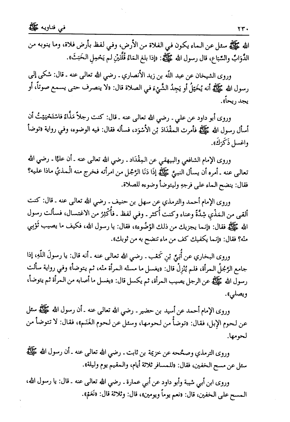 وروى الإمام أحمد والترمذي عن سهل بن حنيف- رضي الله تعالى عنه- قال: كنت ألقى من المذي شدّة وعناء وكنت أكثر- وفي لفظ- فأكثر من الاغتسال، فسألت رسول الله صلى الله عليه وسلم فقال: «إنما يجزيك من ذلك الوضوء» ، فقال: يا رسول الله، فكيف ما يصيب ثوبي منه؟ فقال: «إنما يكفيك كف من ماء تنضح به من ثوبك» .