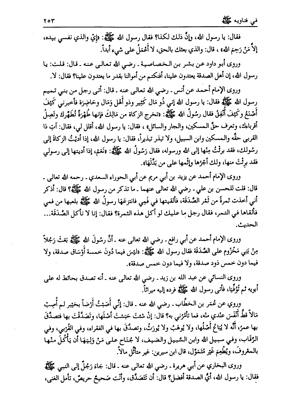وروى الإمام أحمد عن يزيد بن أبي مريم عن أبي الحوراء السعدي- رحمه الله تعالى- قال: قلت للحسن بن علي- رضي الله تعالى عنهما- ما تذكر من رسول الله صلى الله عليه وسلم؟ قال: أذكر أني أخذت ثمرة من ثمر الصّدقة، فألقيتها في فمي فانتزعها رسول الله صلى الله عليه وسلم بلعبها من فمي فألقاها في التمر، فقال رجل ما عليك لو أكل هذه الثمرة؟ فقال: إنّا لا نأكل الصّدقة ...