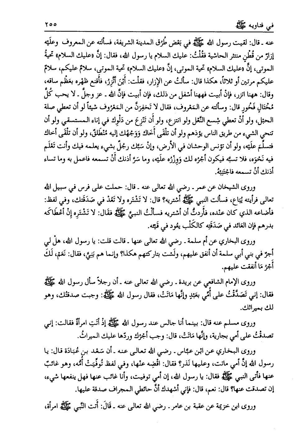 عنه- قال: لقيت رسول الله صلى الله عليه وسلم في بعض طرق المدينة الشريفة، فسألته عن المعروف وعليه إزار من قطن منتثر الحاشية فقلت: عليك السلام يا رسول الله، فقال: إنّ «عليك السلام» تحية الموتى، إنّ «عليك السلام» تحية الموتى، إنّ «عليك السلام» تحية الموتى، سلام عليكم، سلام عليكم مرتين أو ثلاثا، هكذا قال: سألت عن الإزار، فقلت: أين أتّزر، فأقنع ظهره بعظم ساقه، وقال: ههنا اتزر، فإن أبيت فههنا أسفل من ذلك، فإن أبيت فإن الله- عز وجلّ- لا يحب كل مختال فخور قال: وسألته عن المعروف، فقال لا تخفرنّ من المعروف شيئا لو أن تعطي صلة الحبل، ولو أن تعطي شسع النّعل ولو انتزع، ولو أن تنزع من دلوك في إناء المستسقي ولو أن تنحي الشيء من طريق الناس يؤذهم ولو أن تلقى أخاك ووجهك إليه منطلق، ولو أن تلقى أخاك فتسلّم عليه، ولو أن تؤنس الوحشان في الأرض، وإن سبّك رجل بشيء يعلمه فيك وأنت تعلم فيه نحوه، فلا تسبّه فيكون أجره لك ووزره عليه، وما سرّ أذنك أن تسمعه فاعمل به وما تساء أذنك أن تسمعه فاجتنبه.
