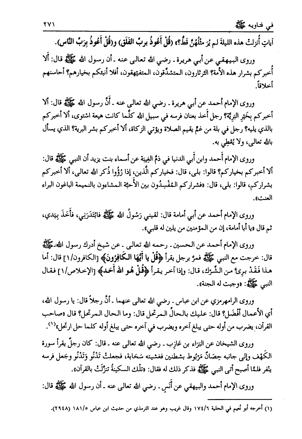 وروى الإمام أحمد عن الحسين- رحمه الله تعالى- عن شيخ أدرك رسول الله صلى الله عليه وسلم قال: خرجت مع النبي صلى الله عليه وسلم فمر برجل يقرأ قُلْ يا أَيُّهَا الْكافِرُونَ [الكافرون/ 1] قال: أما هذا فقد برئ من الشّرك، قال: وإذا آخر يقرأ قُلْ هُوَ اللَّهُ أَحَدٌ [الإخلاص/ 1] فقال النبي صلى الله عليه وسلم: «وجبت له الجنة» .