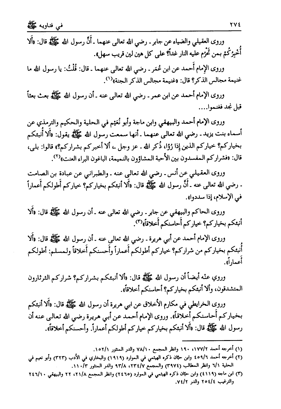 وروى عنه أيضاً أن رسول الله صلى الله عليه وسلم قال: «ألا أنبئكم بشراركم؟ شراركم الثرثارون المتشدقون، وألا أنبئكم بخياركم؟ أحاسنكم أخلاقا» .
