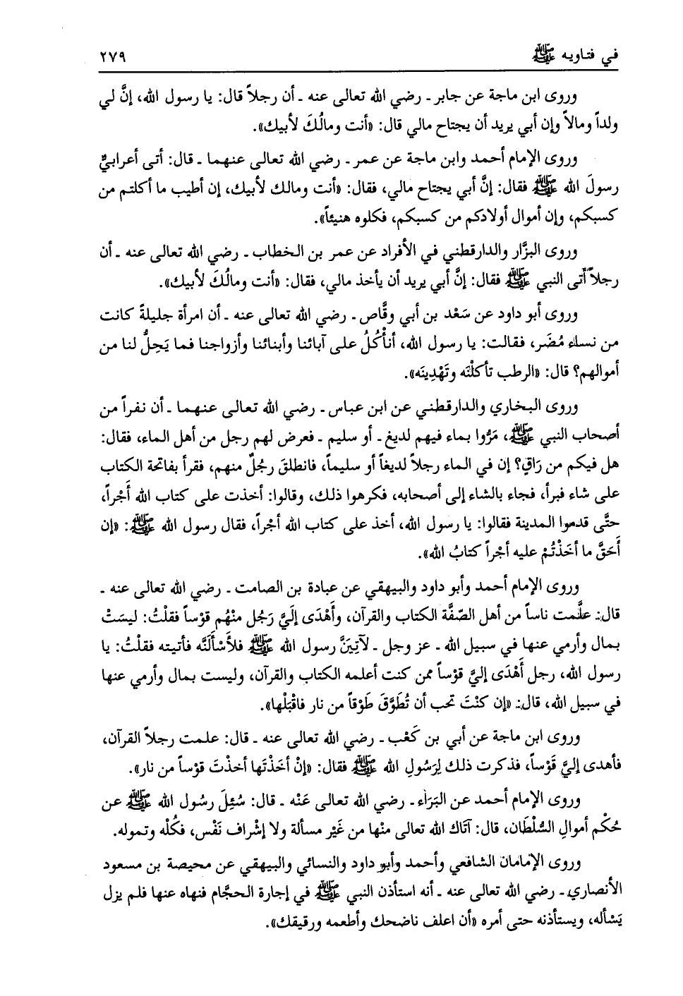 وروى الإمام أحمد وأبو داود والبيهقي عن عبادة بن الصامت- رضي الله تعالى عنه- قال: علّمت ناسا من أهل الصّفّة الكتاب والقرآن، وأهدى إليّ رجل منهم قوسا فقلت: ليست بمال وأرمي عنها في سبيل الله- عز وجل- لآتينّ رسول الله صلى الله عليه وسلم فلأسألنّه فأتيته فقلت: يا رسول الله، رجل أهدى إليّ قوسا ممن كنت أعلمه الكتاب والقرآن، وليست بمال وأرمي عنها في سبيل الله، قال: «إن كنت تحب أن تطوّق طوقا من نار فاقبلها» .