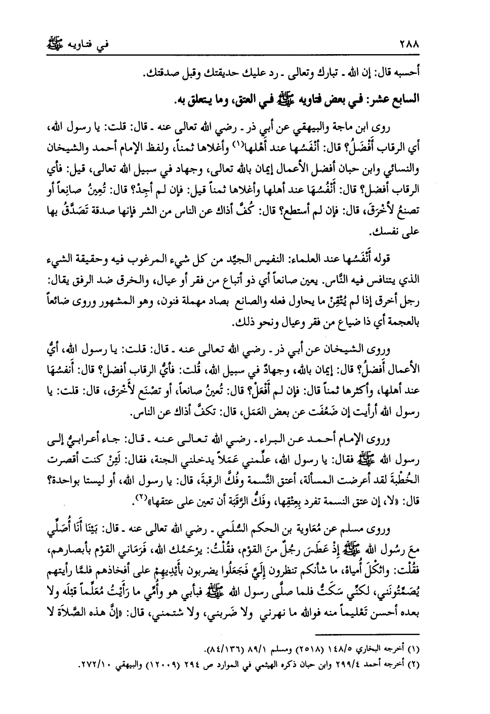 روى ابن ماجة والبيهقي عن أبي ذر- رضي الله تعالى عنه- قال: قلت: يا رسول الله، أي الرقاب أفضل؟ قال: أنفسها عند أهلها [ (1) ] وأغلاها ثمنا، ولفظ الإمام أحمد والشيخان والنسائي وابن حبان أفضل الأعمال إيمان بالله تعالى، وجهاد في سبيل الله تعالى، قيل: فأي الرقاب أفضل؟ قال: أنفسها عند أهلها وأغلاها ثمنا قيل: فإن لم أجد؟ قال: تعين صانعا أو تصنع لأخرق، قال: فإن لم أستطع؟ قال: كفّ أذاك عن الناس من الشر فإنها صدقة تصدّق بها على نفسك.