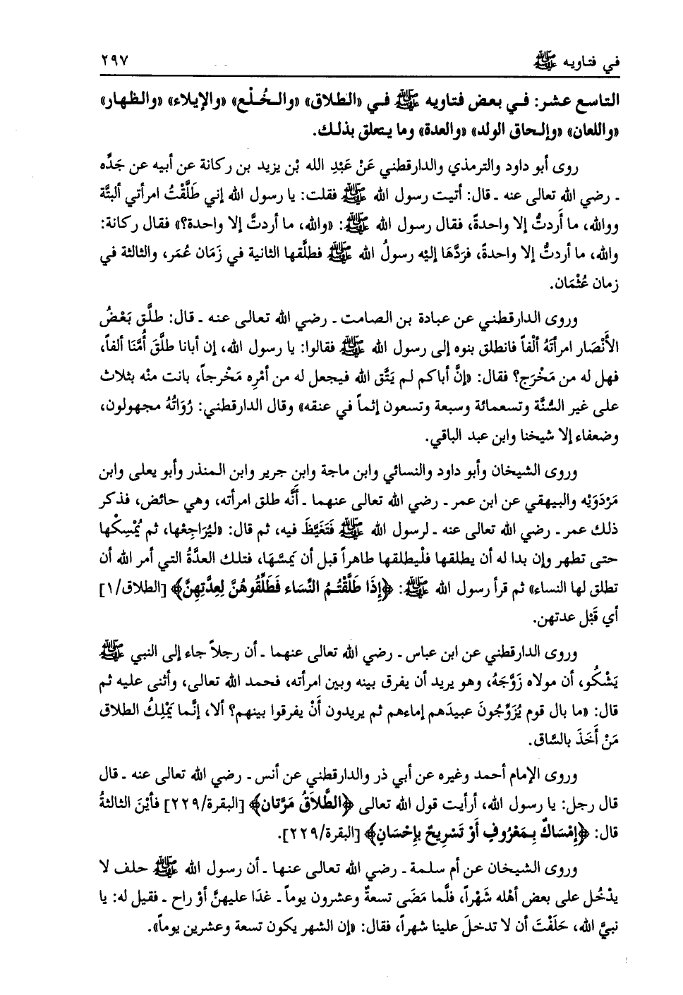 التاسع عشر: في بعض فتاويه صلّى الله عليه وسلم في «الطلاق» «والخلع» «والإيلاء» «والظّهار» «واللّعان» «وإلحاق الولد» «والعدة» وما يتعلق بذلك.