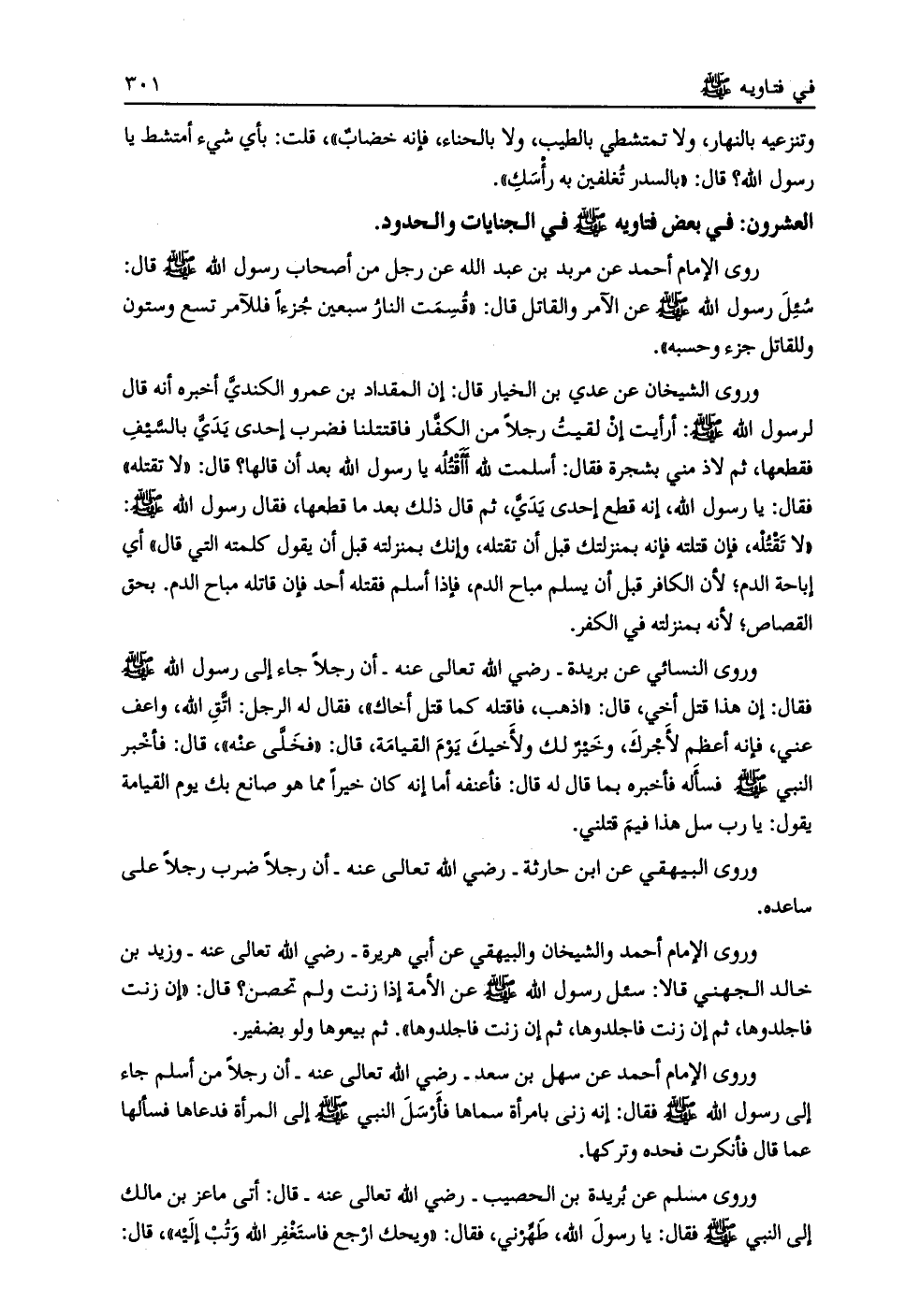 العشرون: في بعض فتاويه صلّى الله عليه وسلم في الجنايات والحدود.