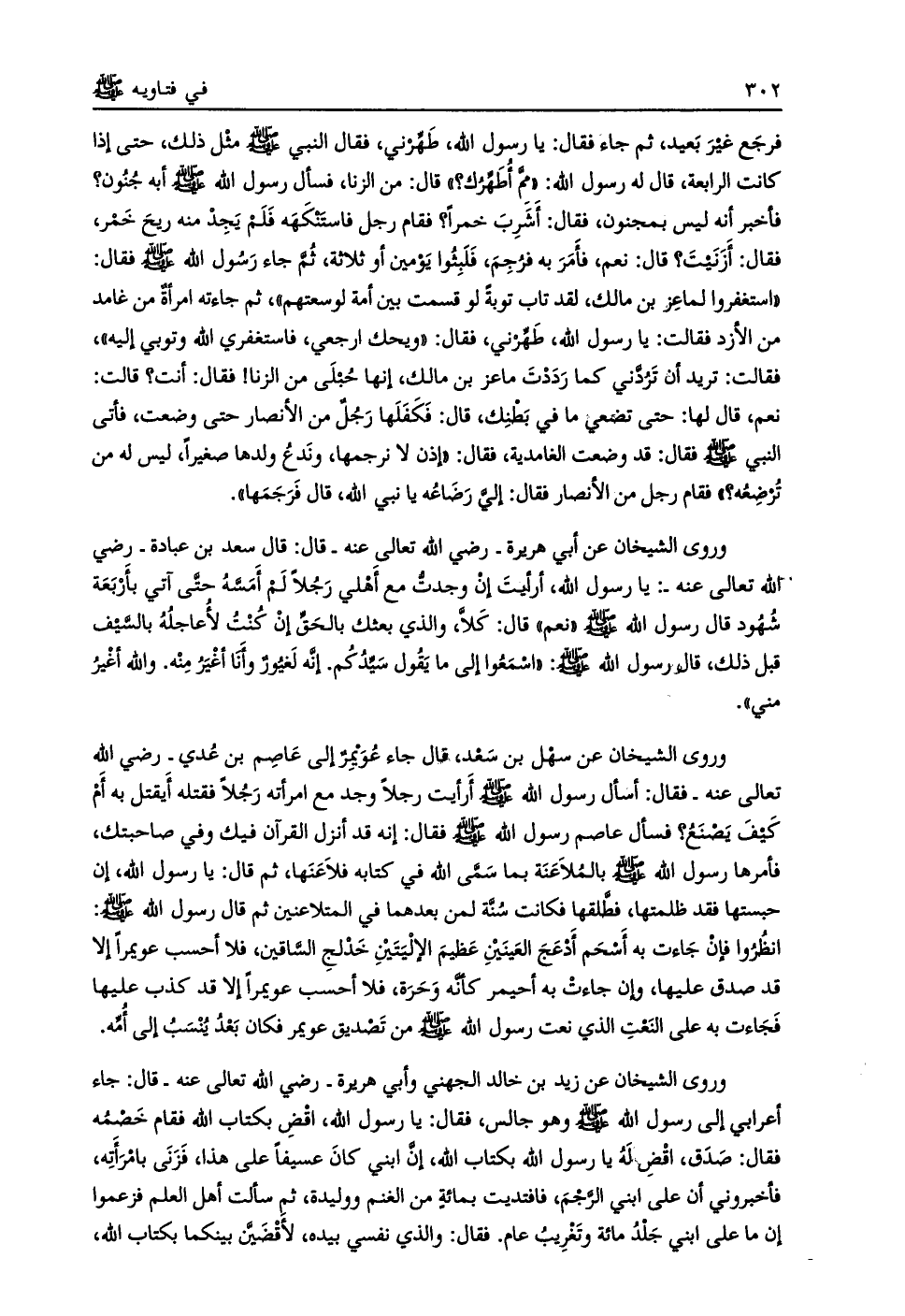 وروى الشيخان عن زيد بن خالد الجهني وأبي هريرة- رضي الله تعالى عنه- قال: جاء أعرابي إلى رسول الله صلى الله عليه وسلم وهو جالس، فقال: يا رسول الله، اقض بكتاب الله فقام خصمه فقال: صدق، اقض له يا رسول الله بكتاب الله، إن ابني كان عسيفا على هذا، فزنى بامرأته، فأخبروني أن على ابني الرّجم، فافتديت بمائة من الغنم ووليدة، ثم سألت أهل العلم فزعموا إن ما على ابني جلد مائة وتغريب عام. فقال: والذي نفسي بيده، لأقضيّن بينكما بكتاب الله،