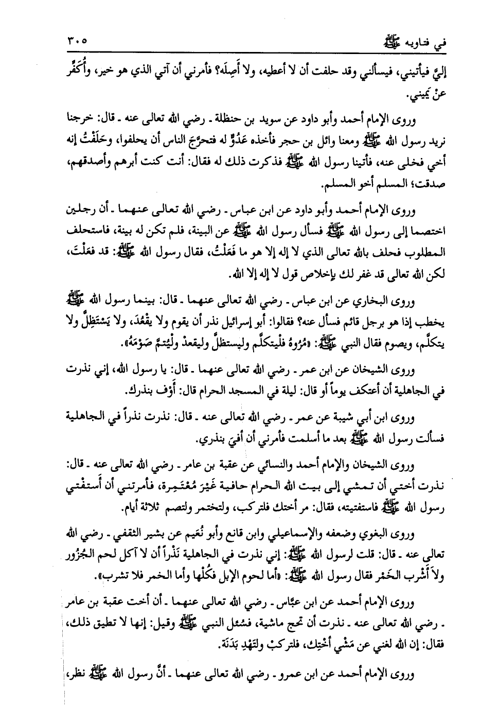 وروى الشيخان والإمام أحمد والنسائي عن عقبه بن عامر- رضي الله تعالى عنه- قال: نذرت أختي أن تمشي إلى بيت الله الحرام حافية غير معتمرة، فأمرتني أن أستفتي رسول الله صلى الله عليه وسلم فاستفتيته، فقال: مر أختك فلتركب، ولتختمر ولتصم ثلاثة أيام.