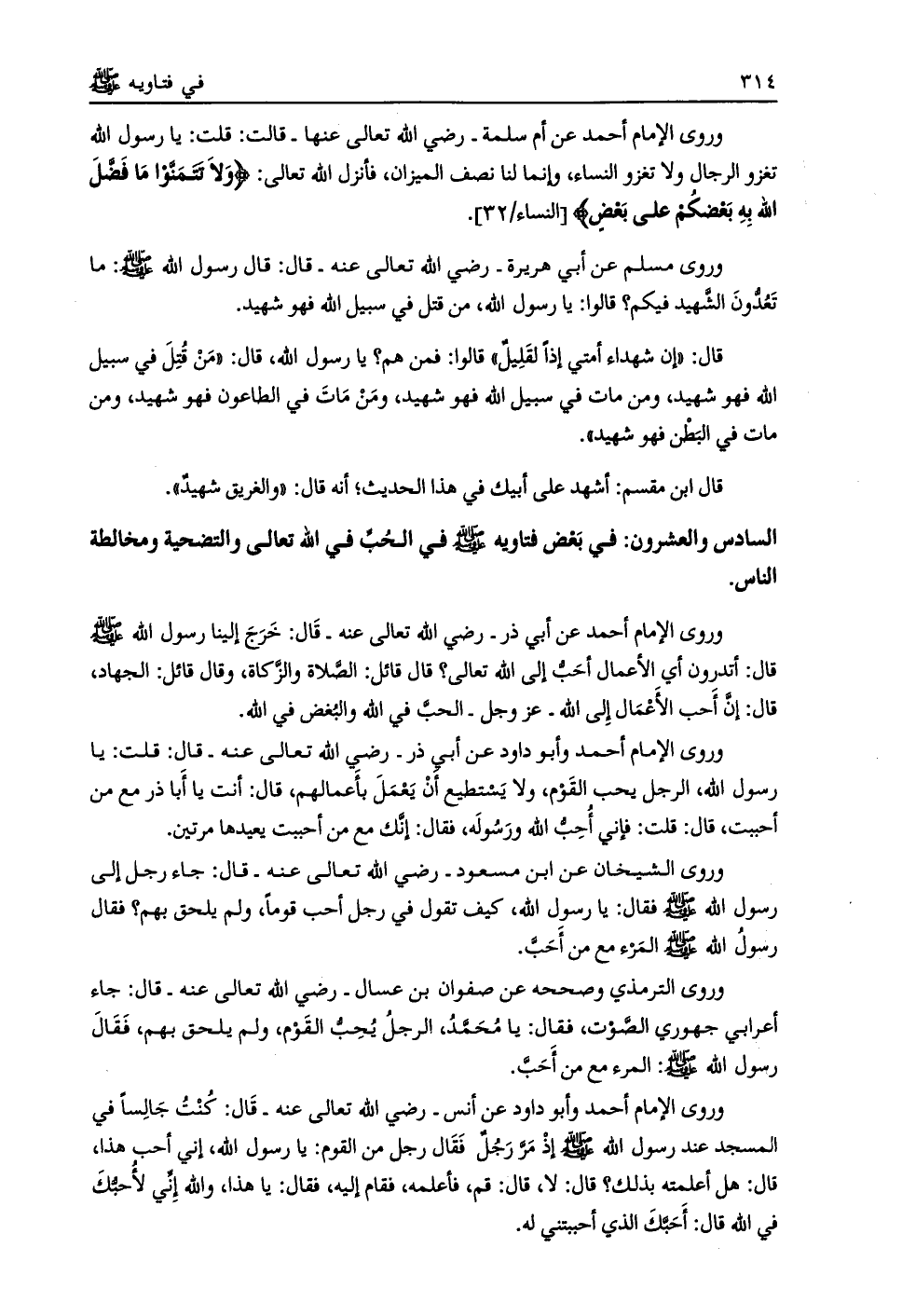 السادس والعشرون: في بعض فتاويه صلّى الله عليه وسلم في الحبّ في الله تعالى والتضحية ومخالطة الناس.
