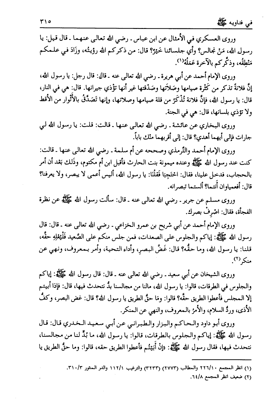 وروى الإمام أحمد عن أبي شريح بن عمرو الخزاعي- رضي الله تعالى عنه- قال: قال رسول الله صلى الله عليه وسلم: إياكم والجلوس على الصعدات، فمن جلس منكم على الصّعيد فليعله حقّه، قلنا: يا رسول الله، وما حقّه؟ قال: غضّ البصر، وأداء التحية، وأمر بمعروف، ونهي عن منكر [ (2) ] .