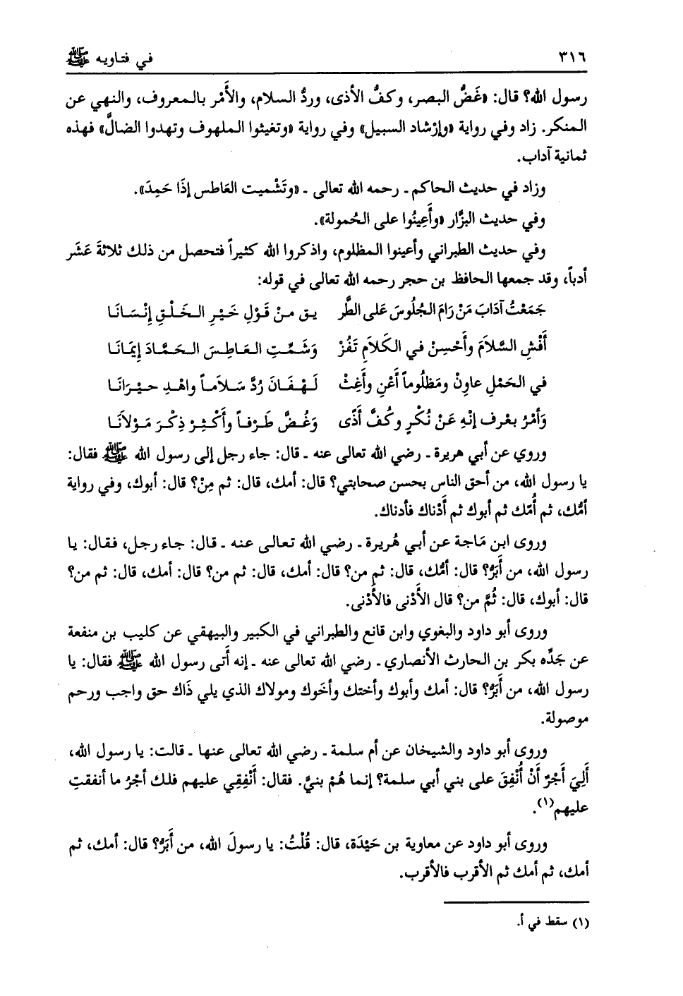 وروى ابن ماجه عن أبي هريرة- رضي الله تعالى عنه- قال: جاء رجل، فقال: يا رسول الله، من أبرّ؟ قال: أمّك، قال: ثم من؟ قال: أمك، قال: ثم من؟ قال: أمك، قال: ثم من؟