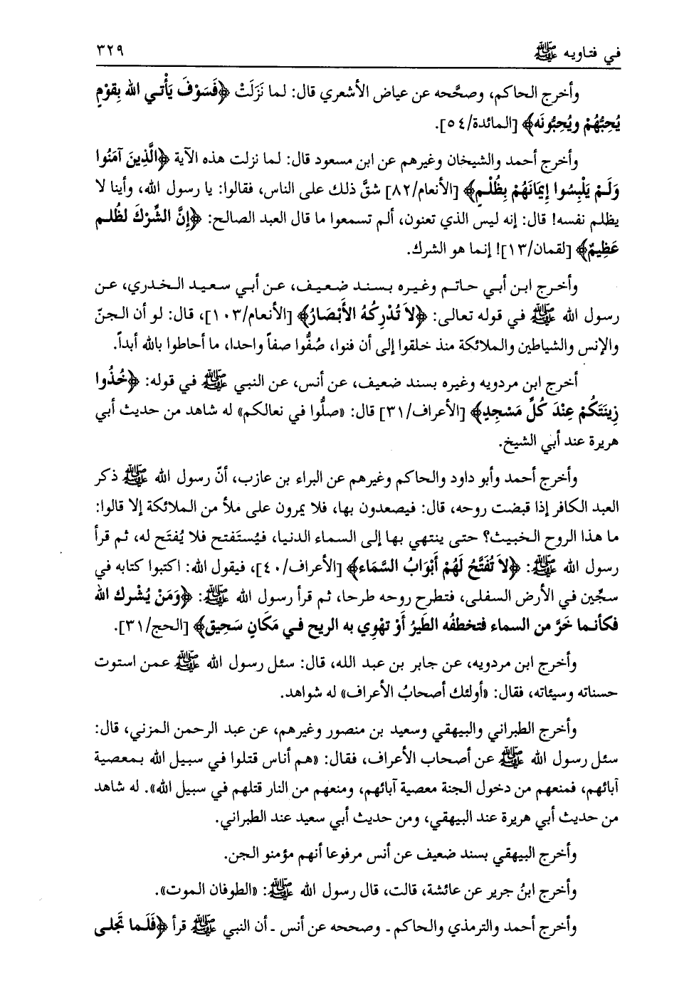 وأخرج ابن مردويه، عن جابر بن عبد الله، قال: سئل رسول الله صلى الله عليه وسلّم عمن استوت حسناته وسيئاته، فقال: «أولئك أصحاب الأعراف»