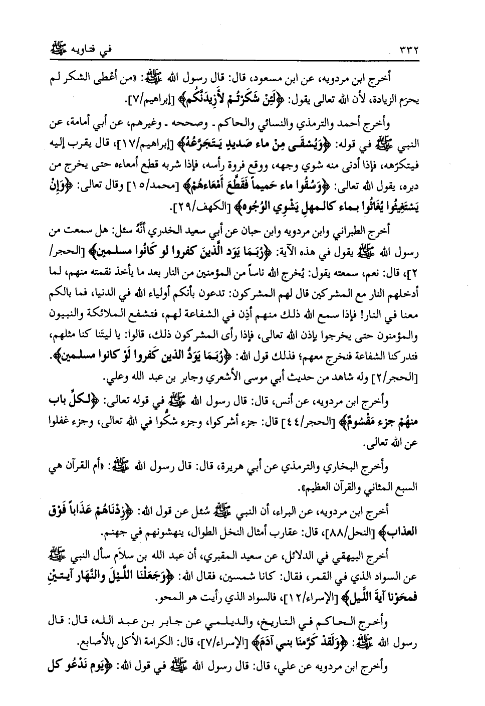 أخرج الطبراني وابن مردويه وابن حبان عن أبي سعيد الخدري أنّه سئل: هل سمعت من رسول الله صلى الله عليه وسلم يقول في هذه الآية: رُبَما يَوَدُّ الَّذِينَ كَفَرُوا لَوْ كانُوا مُسْلِمِينَ [الحجر/ 2] ، قال: نعم، سمعته يقول: يخرج الله ناسا من المؤمنين من النار بعد ما يأخذ نقمته منهم، لما أدخلهم النار مع المشركين قال لهم المشركون: تدعون بأنكم أولياء الله في الدنيا، فما بالكم معنا في النار! فإذا سمع الله ذلك منهم أذن في الشفاعة لهم، فتشفع الملائكة والنبيون والمؤمنون حتى يخرجوا بإذن الله تعالى، فإذا رأى المشركون ذلك، قالوا: يا ليتنا كنا مثلهم، فتدركنا الشفاعة فنخرج معهم، فذلك قول الله: رُبَما يَوَدُّ الَّذِينَ كَفَرُوا لَوْ كانُوا مُسْلِمِينَ.