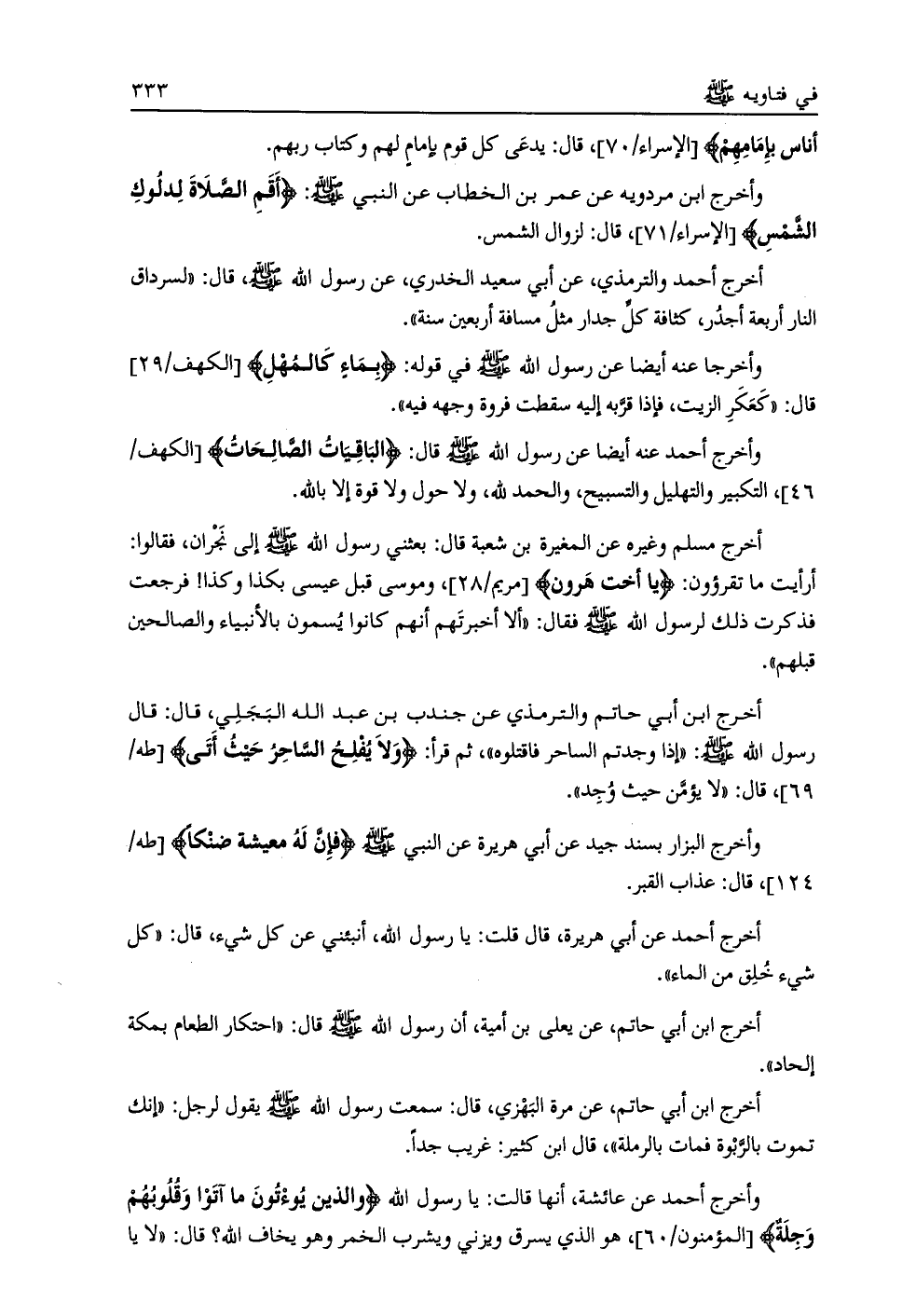 وأخرج أحمد عنه أيضاً عن رسول الله صلى الله عليه وسلم قال: الْباقِياتُ الصَّالِحاتُ [الكهف/ 46] ، التكبير والتهليل والتسبيح، والحمد لله، ولا حول ولا قوة إلا بالله.